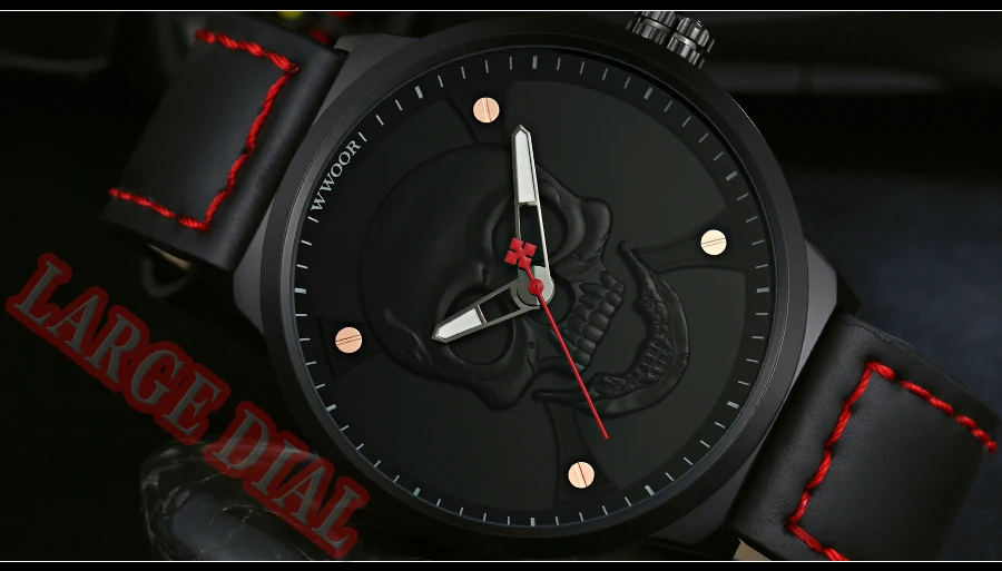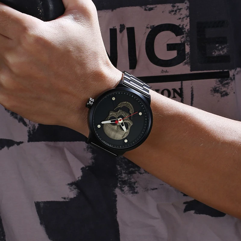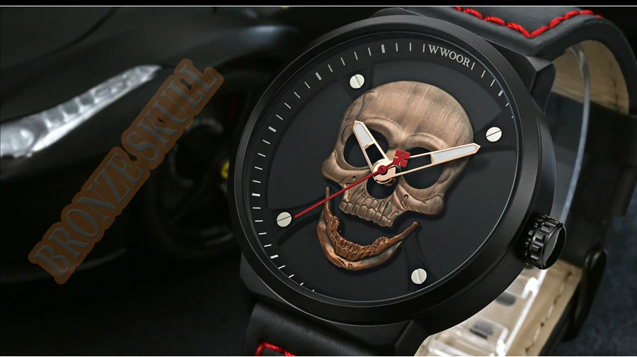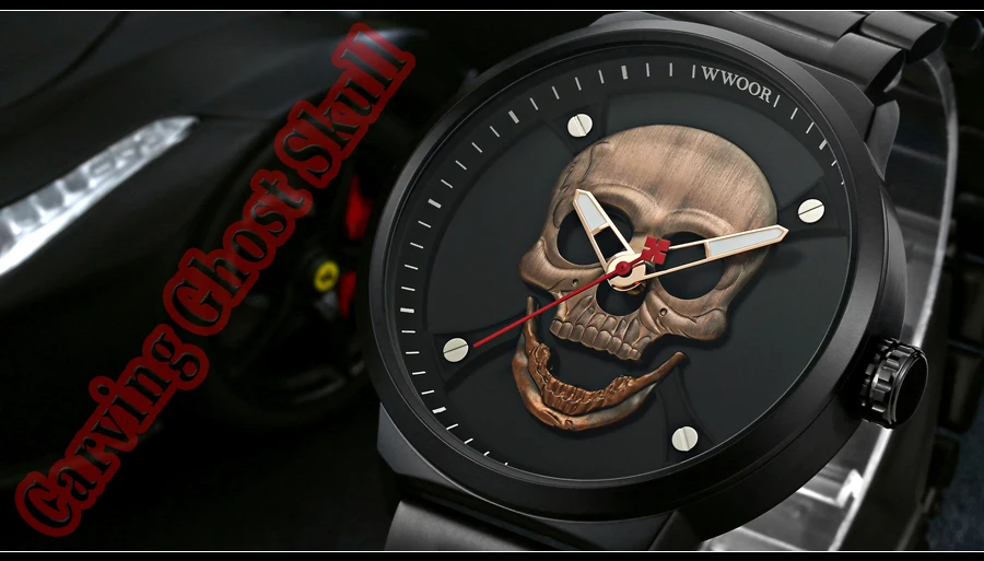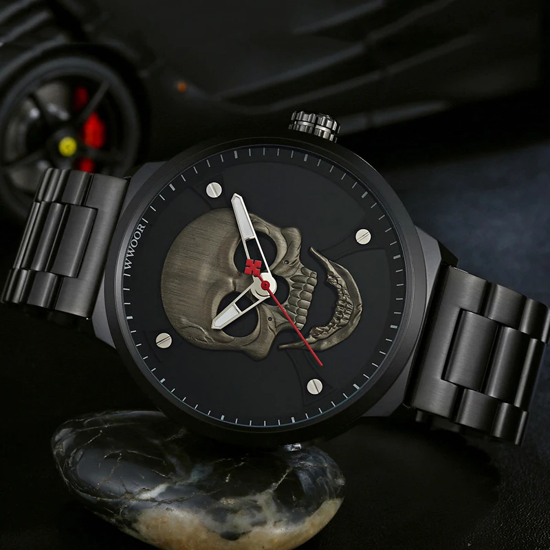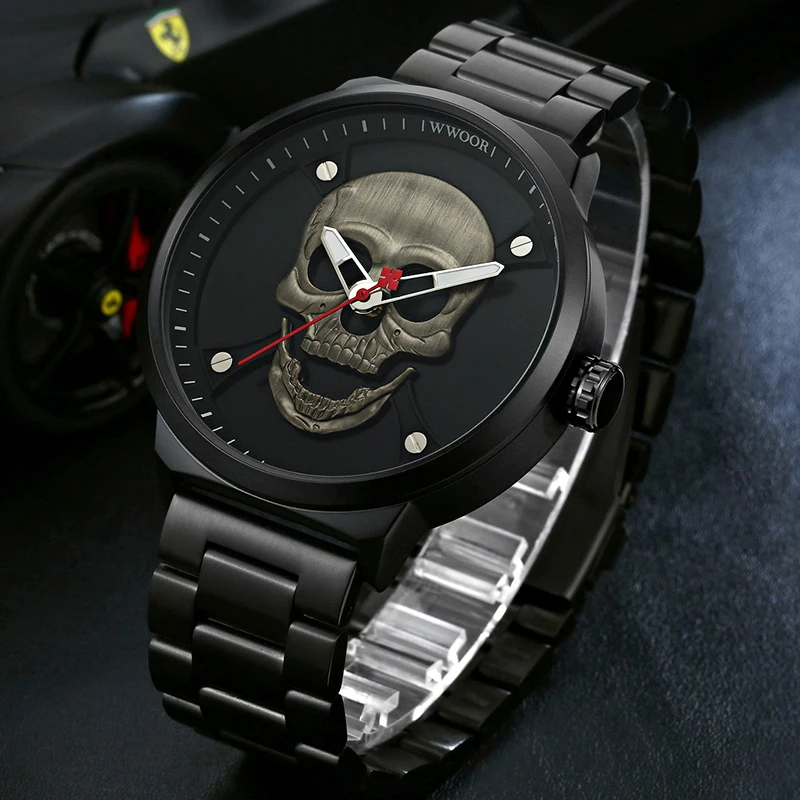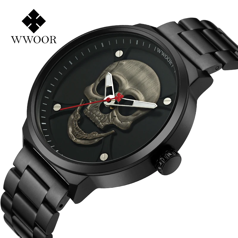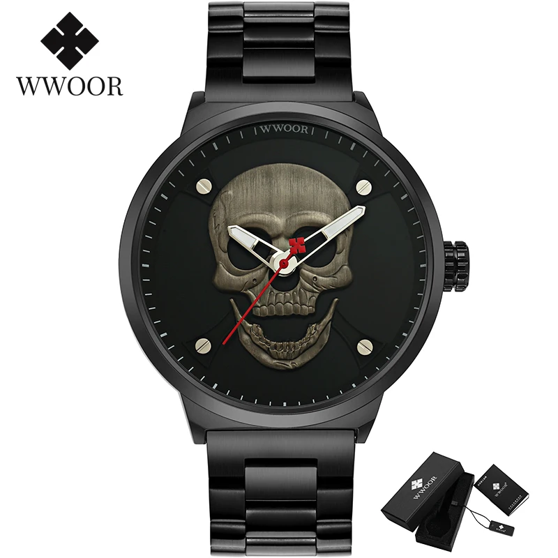 Часы WWOOR Мужские кварцевые в винтажном стиле, официальный бренд, спортивные с 3d-изображением черепа из нержавеющей стали