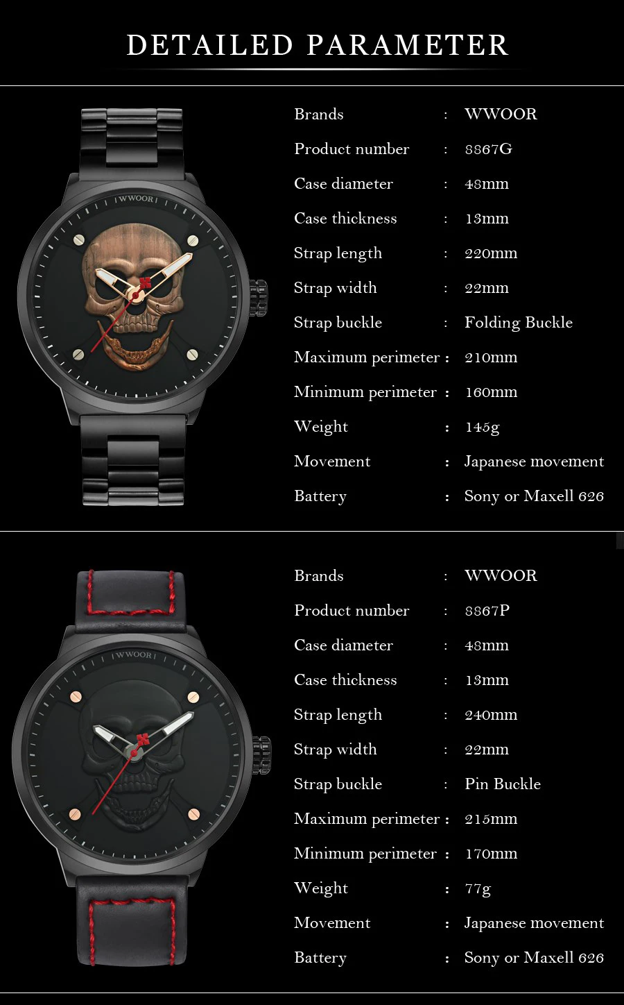 Стиль: Модный, Повседневный, Спортивный, хип-хоп-Водонепроницаемость 3 АТМ/30 м (поддерживает душ в холодной воде, пожалуйста, не используйте часы под водой);-Кварцевый механизм высокого качества;-Чехол из цинкового сплава;-Ремешок из нержавеющей стали;-Ремешок из натуральной кожи;Характеристики (Приблизительные):-Чехол диаметр: 48,0 мм-Чехол Толщина: 13,0 мм-Полоса пропускания: 22 мм-Общая длина: 240 мм-Вес изделия: г watch-145g; П watch-77gПосылка включает в себя:-1 x WWOR/мужские часы-1 подарочная коробка WWOOR-1 x чистая ткань-1 инструмент для регулировки ремня