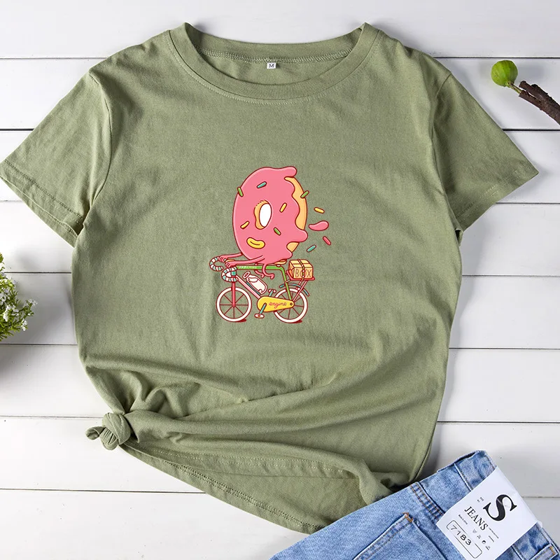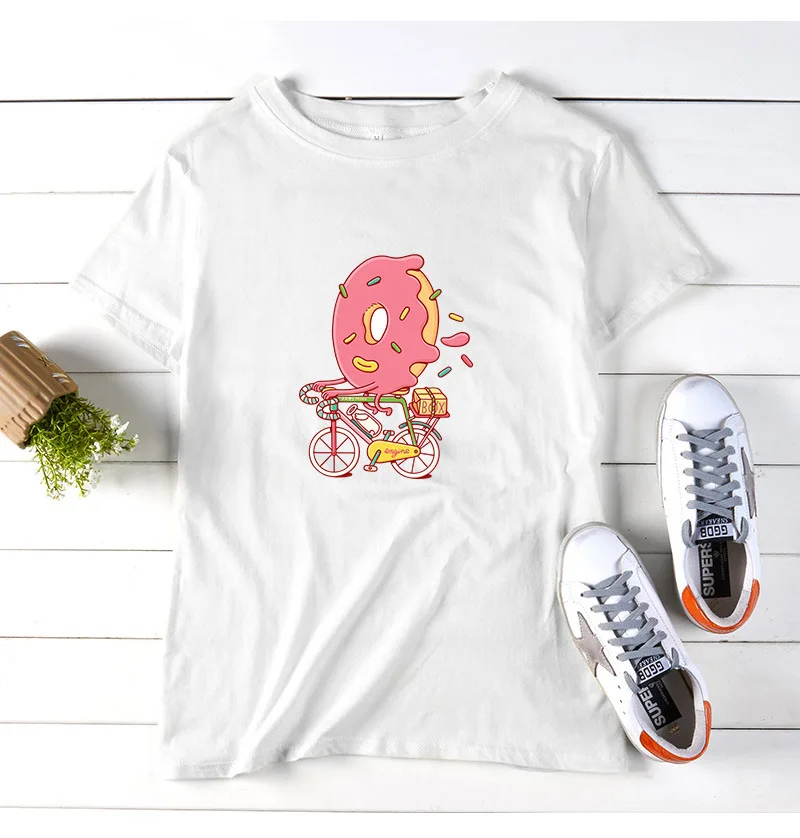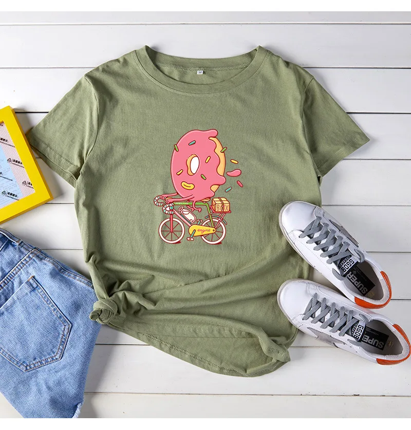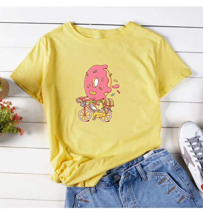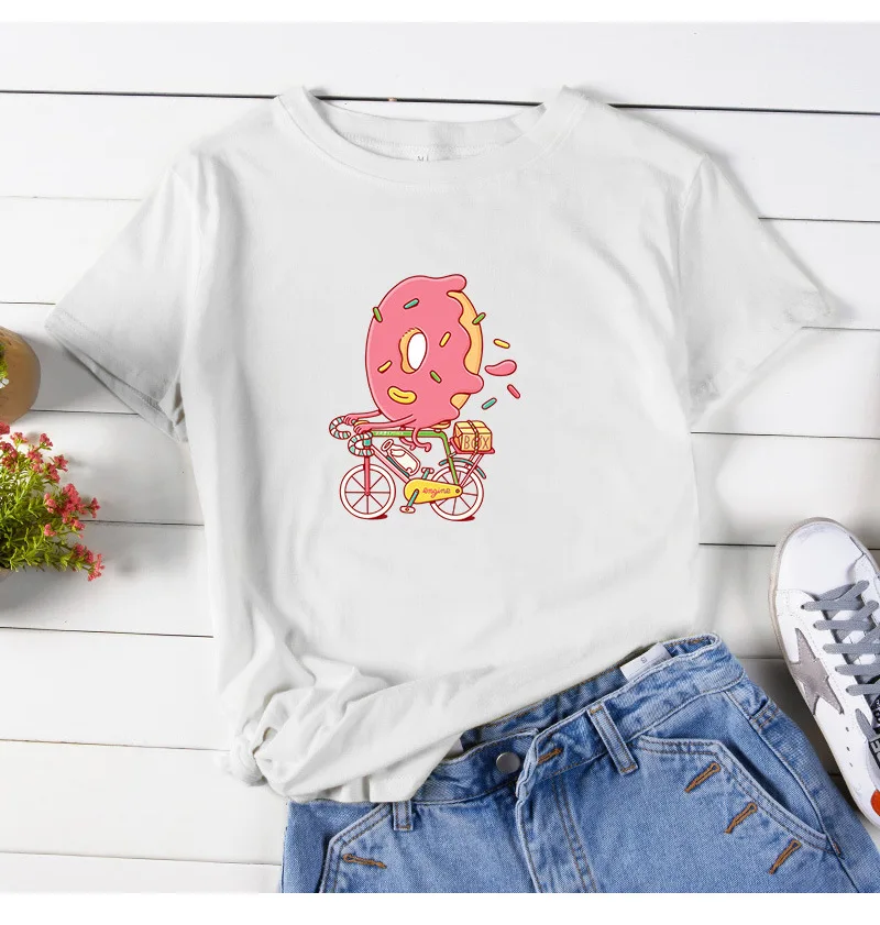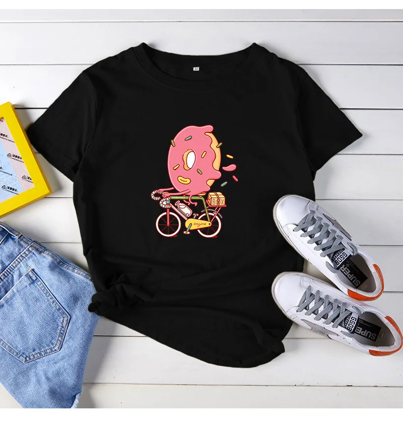 Женская футболка Летняя хлопковая Футболка 5XL размера плюс с короткими рукавами и мультяшным принтом и забавные пончик с принтом в виде велосипеда и повседневные женские футболки топы принтовые тройники