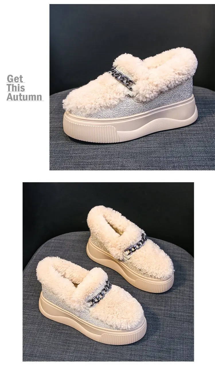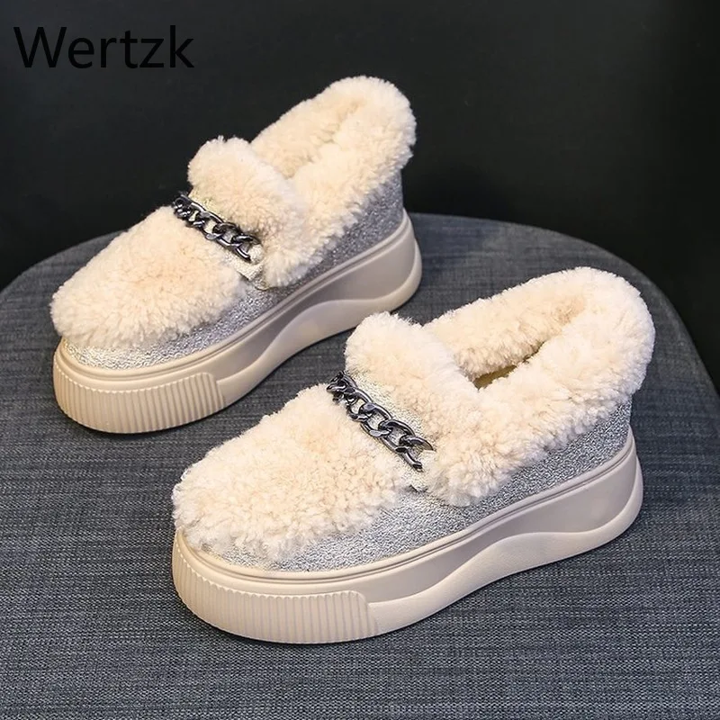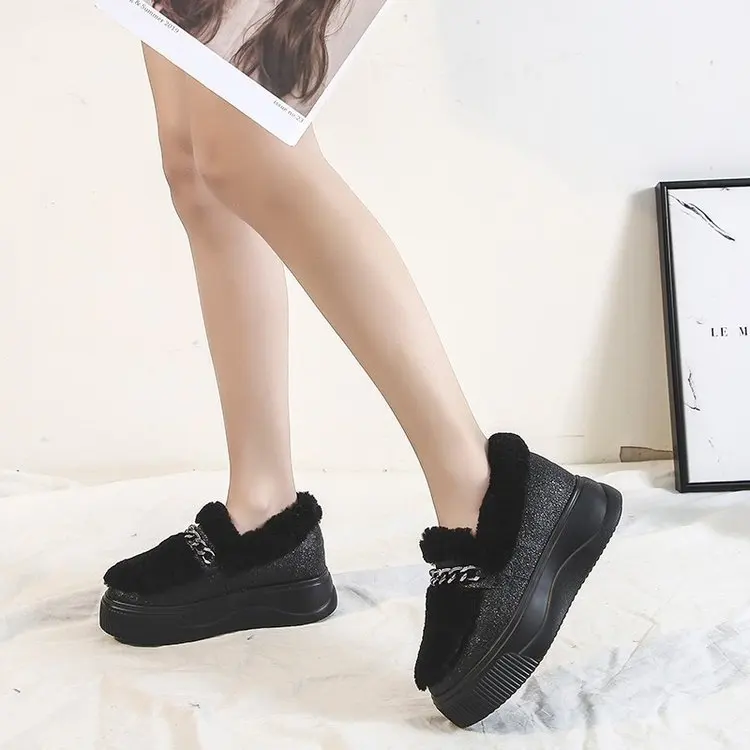 Женские ботинки на толстой подошве, зимние, модные, с металлической цепочкой, с круглым носком, теплые, однотонные, 7 см, с плюшевой подкладкой