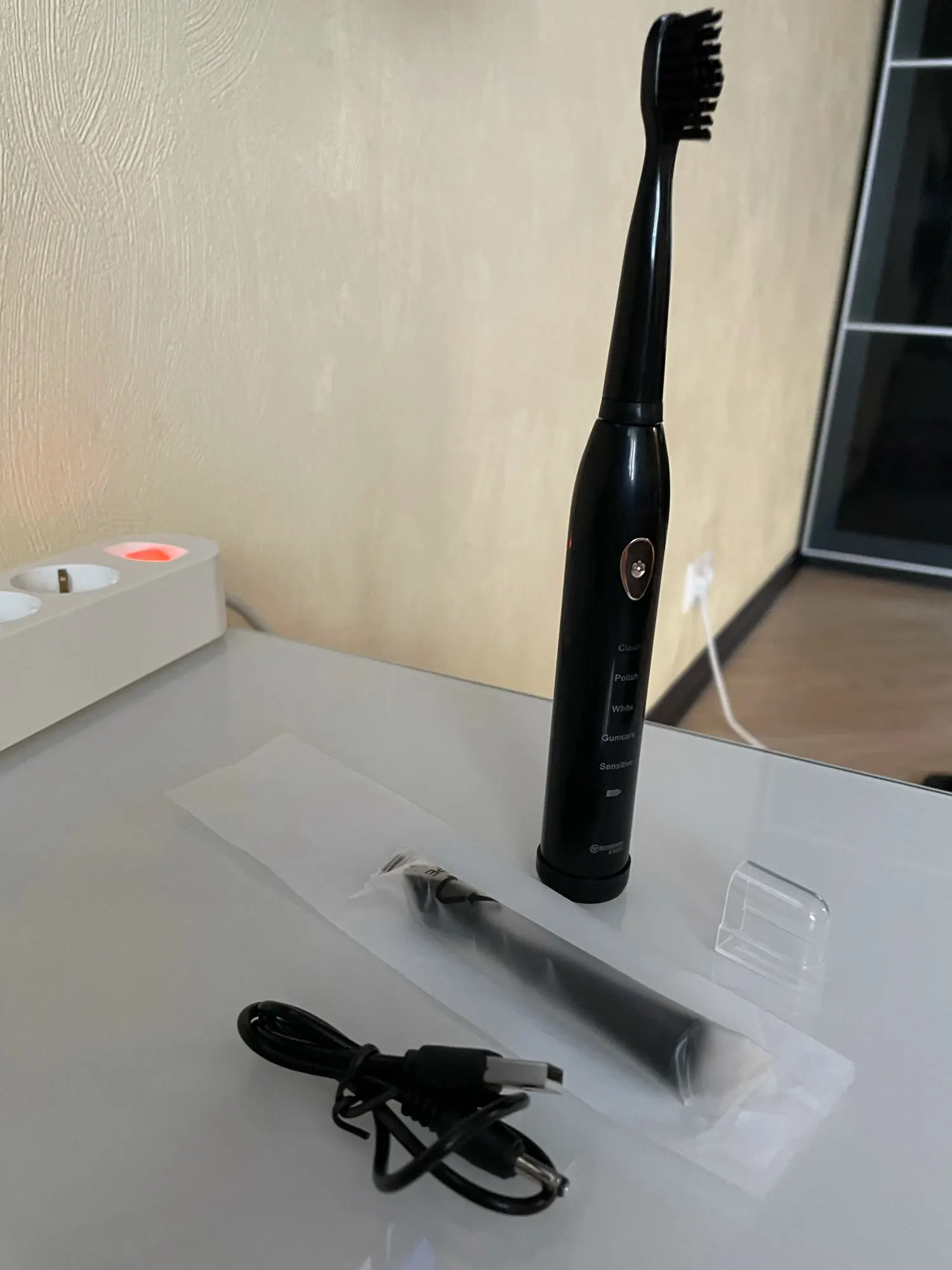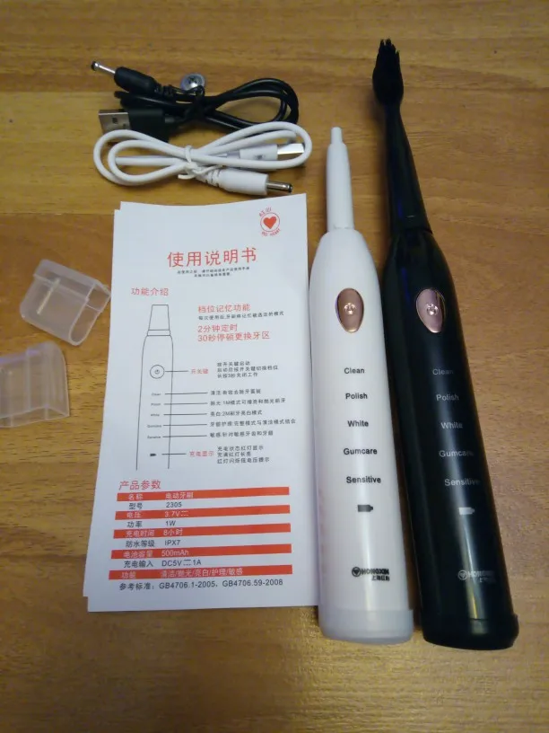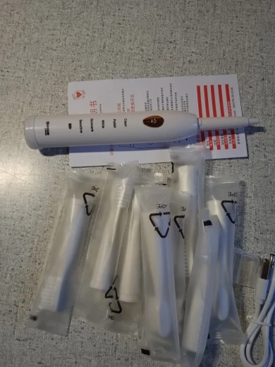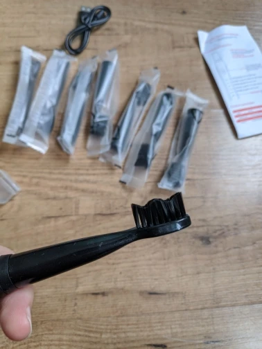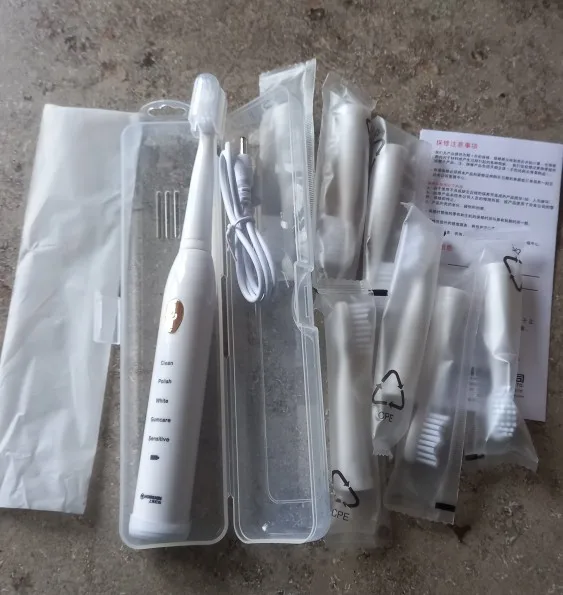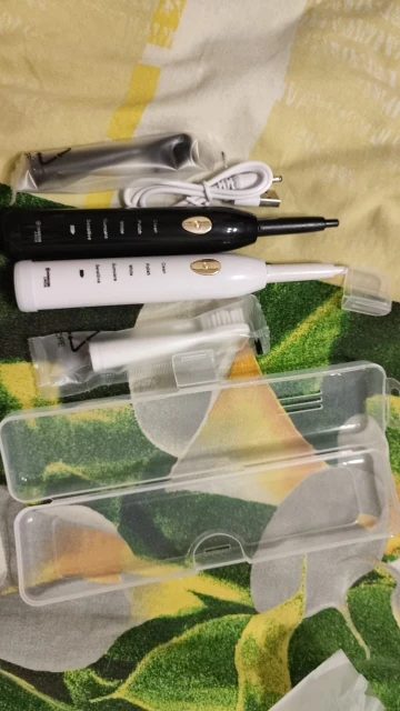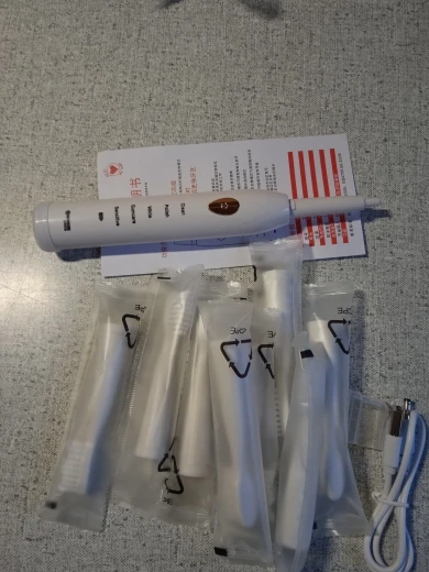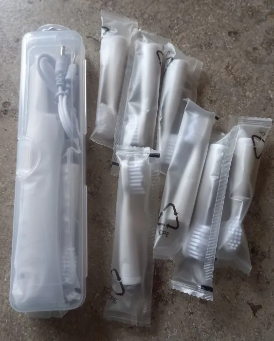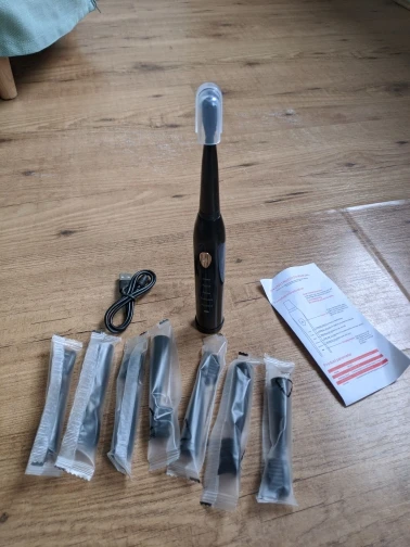 Зубная щетка поставляется со всеми: 8 головками, кабелем для зарядки, инструкциями и защитой головы. Примерил, отлично работает. Очень хорошо очищает, не повреждая и не вызывая кровотечения. Играйте с различными режимами, они хорошие, но нет большой разницы. В конце концов, все они очищают зубы до той же степени, просто с различными скоростями вибрации и узорами. Порт зарядки защищен резиной, которая также защищает зубную щетку от скольжения. Кажется, что вода хорошо держится вдали, но я все еще чувствую себя немного некомфортно с ней. На головках красивые, мягкие ворсинки. Зубная щетка имеет встроенный таймер. Качество хорошее по этой цене, но пластик ощущается немного дешево. Кроме того, я не уверен, насколько водонепроницаема кнопка питания. Я заказал товар с доставкой в течение 10 дней, и он пришел через 15 дней. В целом, по этой цене, я очень доволен всем.