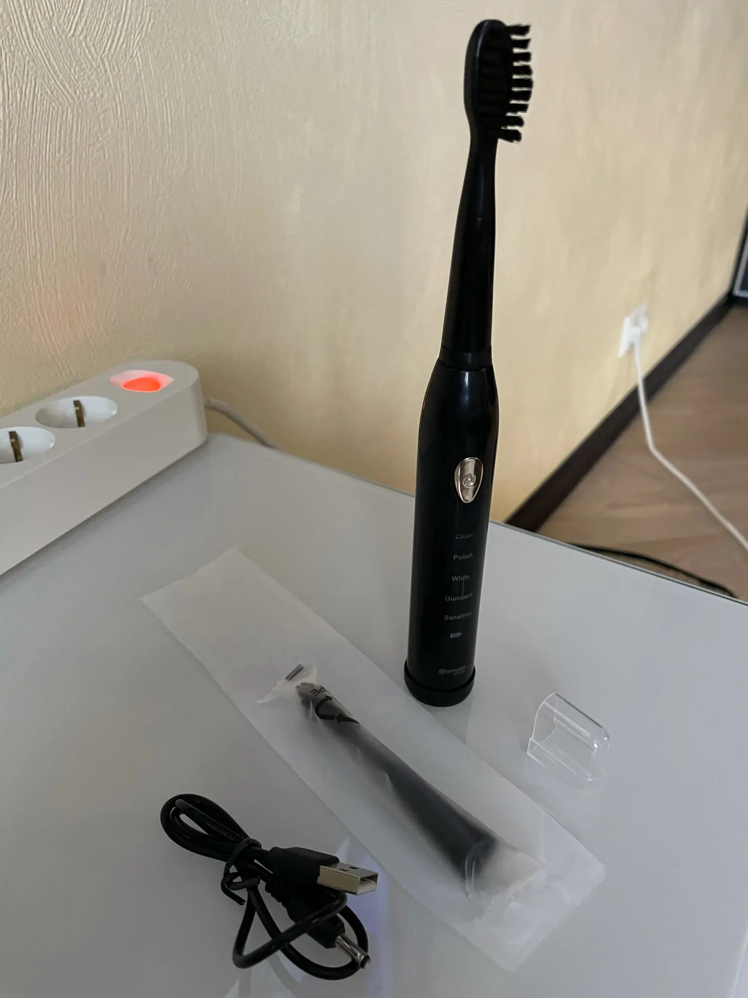 Хорошая зубная щётка,все режимы работы различны,что соответствует описанию. Пришла в комплекте с восемью насадками и зарядным шнурком. На ощупь материал приятный,в руке не скользит,на счёт очистки зубов - время покажет, щетина не сильно жёсткая. Мне очень нравится. Покупал примерно за 500р. Товар пришел быстро, поэтому Спасибо продавцу)