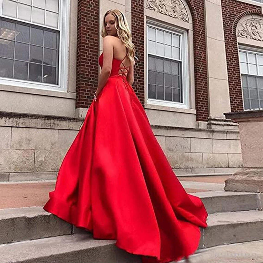 Женское длинное Атласное Бальное Платье-трапеция на тонких бретелях с V-образным вырезом и бисером, бальное платье с карманами, vestidos de fiesta,