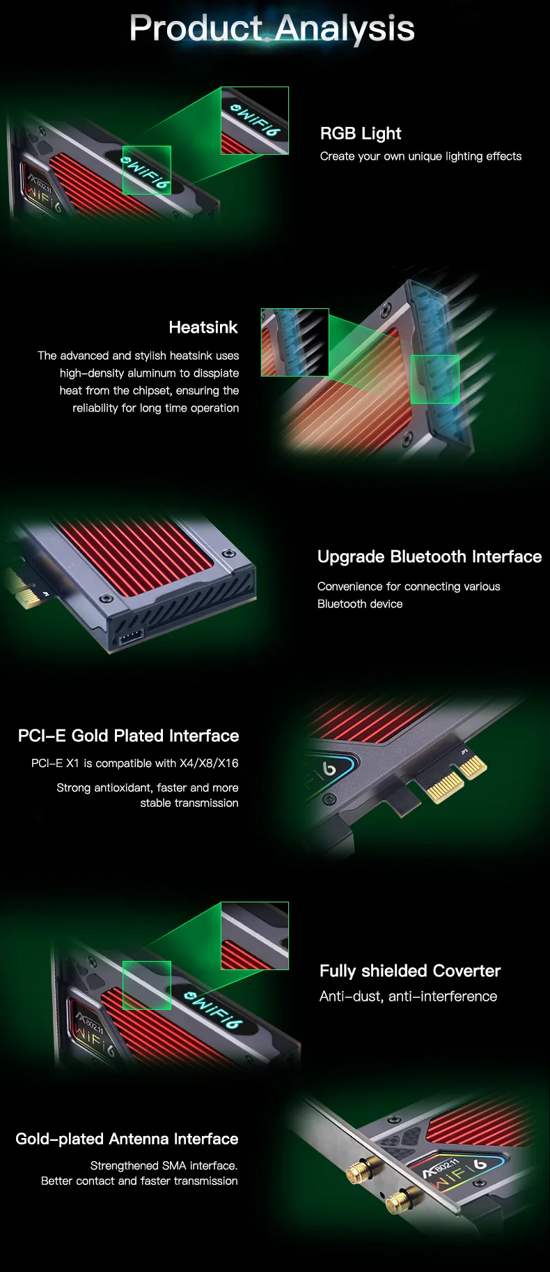 Особенность:Мгновенное обновление Wi-Fi 802.11ax для настольного компьютера: больше не нужны запутанные кабели ethernet;Чип Wi-Fi 6 ax200 802.11ax для сверхбыстрого подключения до 2400 Мбит/с;Возможность выбора двух диапазонов частот 2,4 ГГц и 5 ГГц с обратной совместимостью со всеми существующими устройствами;Конструкция высокой мощности для увеличения покрытия сигнала;Специально разработанный радиатор гарантирует стабильную и надежную непрерывную работу.FV-AX3000RGBМодель: FV-AX3000 адаптер Wi-Fi для настольного компьютера (veja details)Чипсет: AX200 чипсетСтандарт Ieee: 802.11ac/axCom Blutetooth 5,1Банда dupla 2,4 ghz-300mbps/5ghz-2400mbpsПоддержка MU-MIMOПримечание: скорость до 2400 Мбит/с (поддержка устройства 802.11ax)Операционная система: apenas suportam windows 10 * 64bitСовместимость с com: quase computador com pci express (слот pci-E 1x/4x/16x)