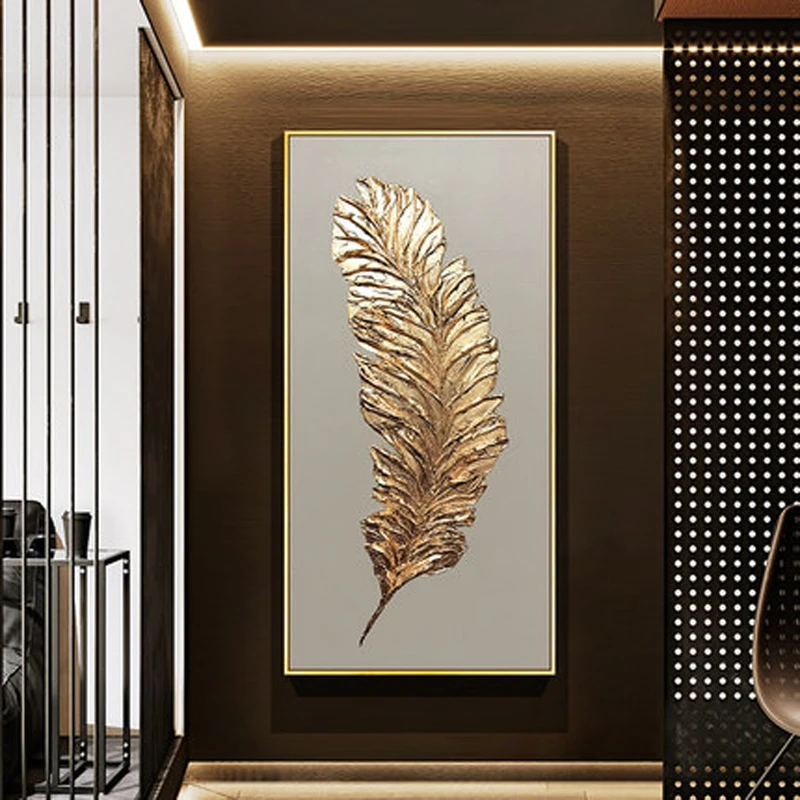 Картина на холсте с золотыми перьями на заказ, настенная художественные плакаты и принты с листьями из перьев, настенные картины для декора гостиной
