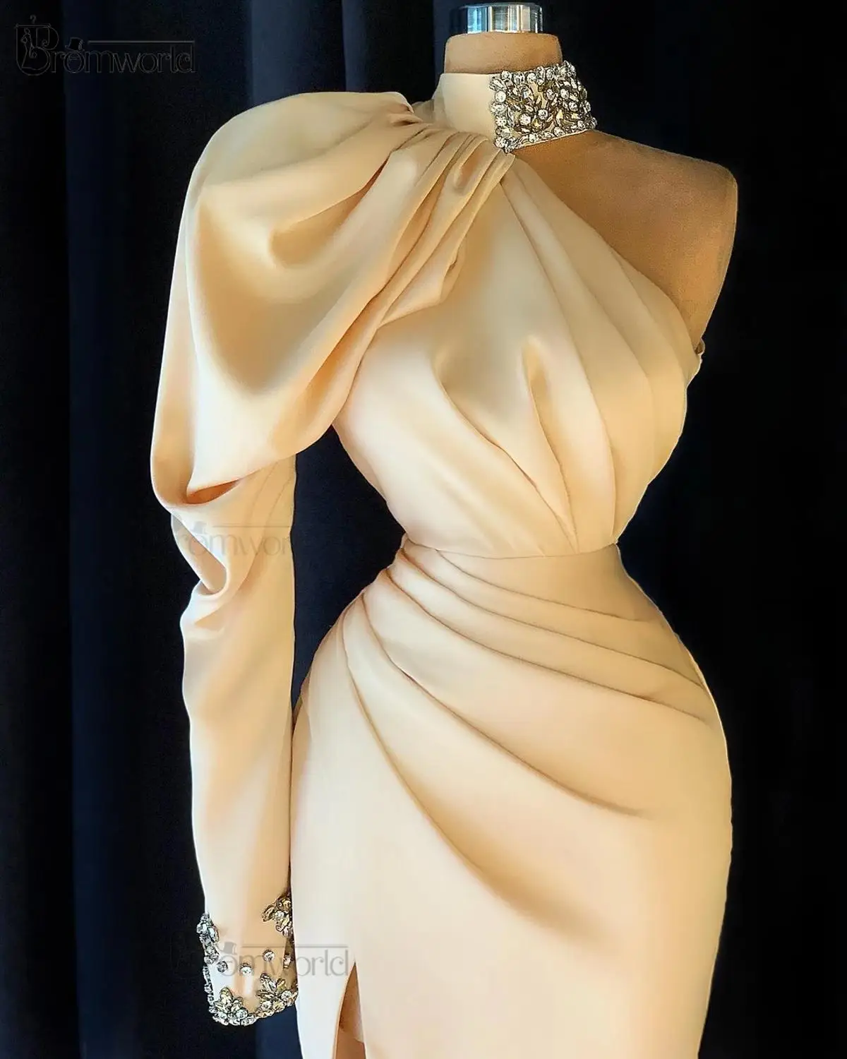 Женское вечернее платье с юбкой годе, элегантное бежевое атласное платье с одним открытым плечом и длинным рукавом, с высоким разрезом, для выпускного вечера