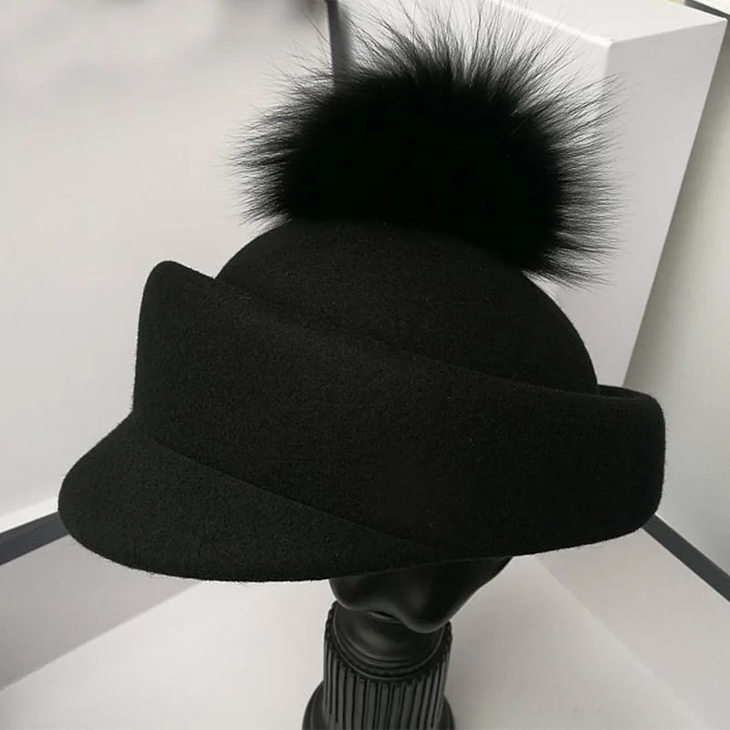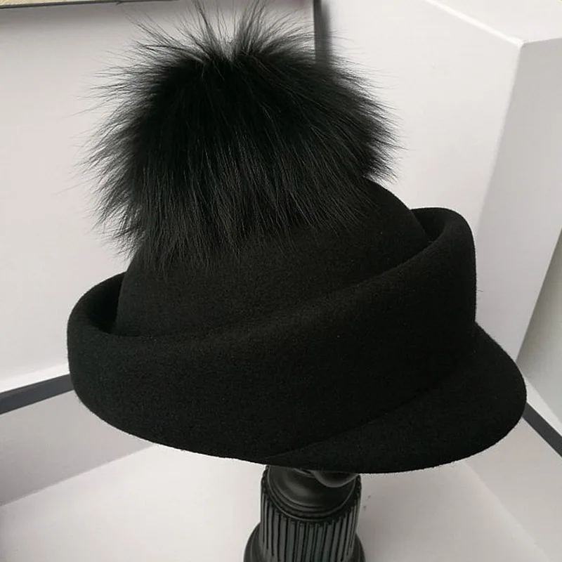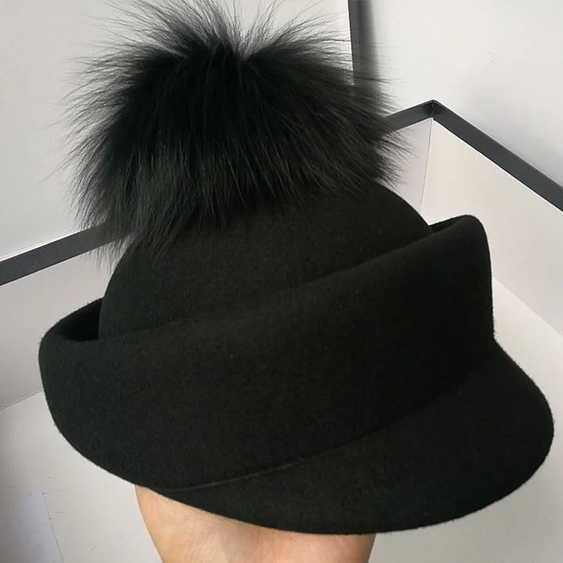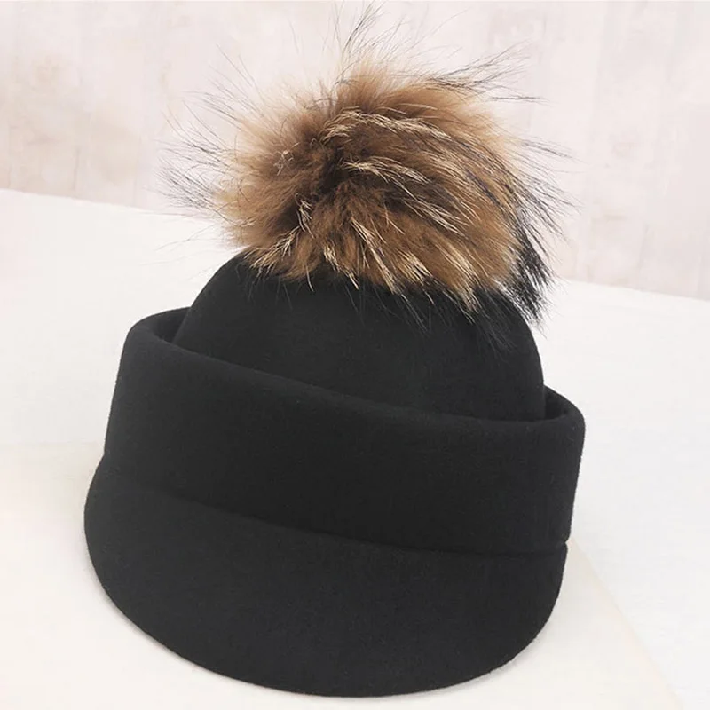 Берет женский шерстяной, Повседневная теплая шапка из натурального меха, с помпоном, для взрослых, зимний, черного цвета