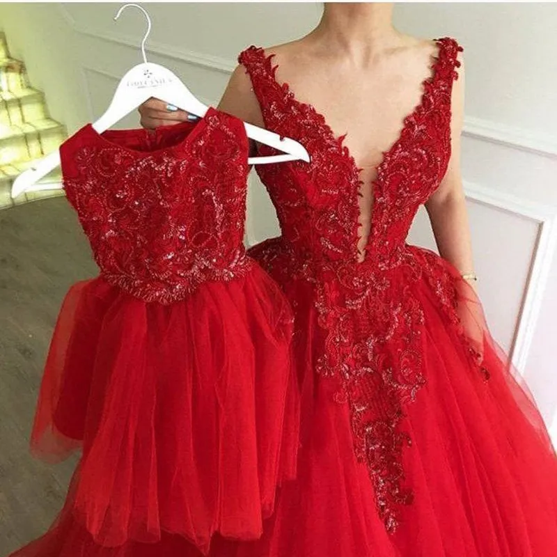 Красные Роскошные кружевные платья с бисером для мамы и дочки, винтажные кружевные платья для мамы и дочки, платья, фото платье на заказ