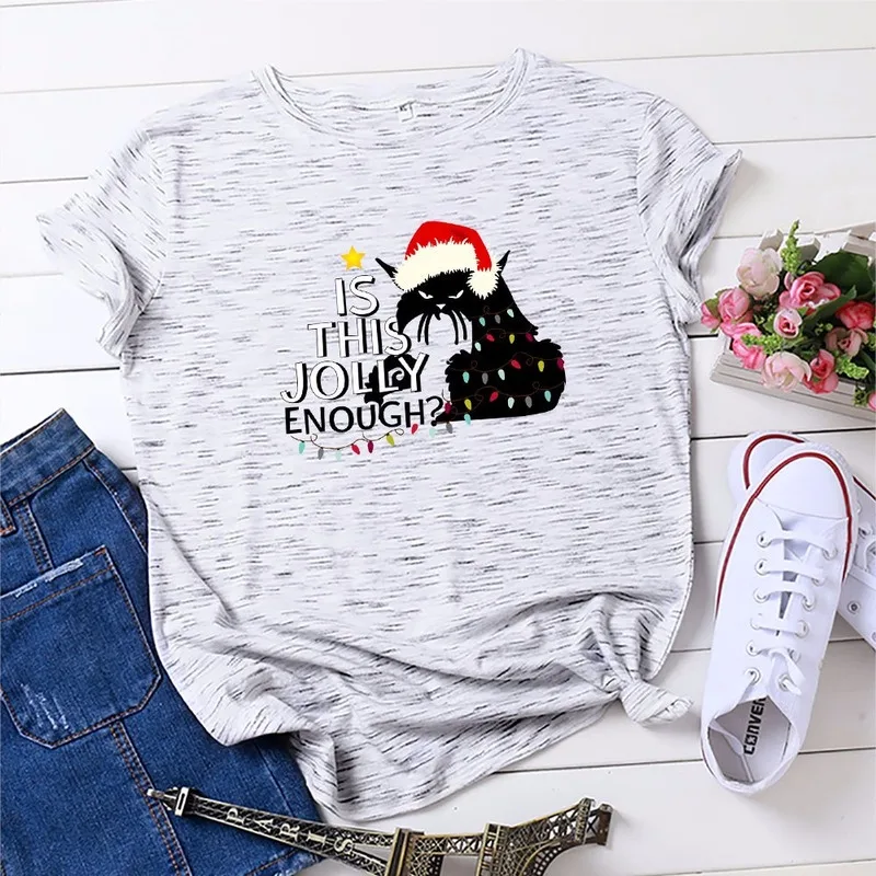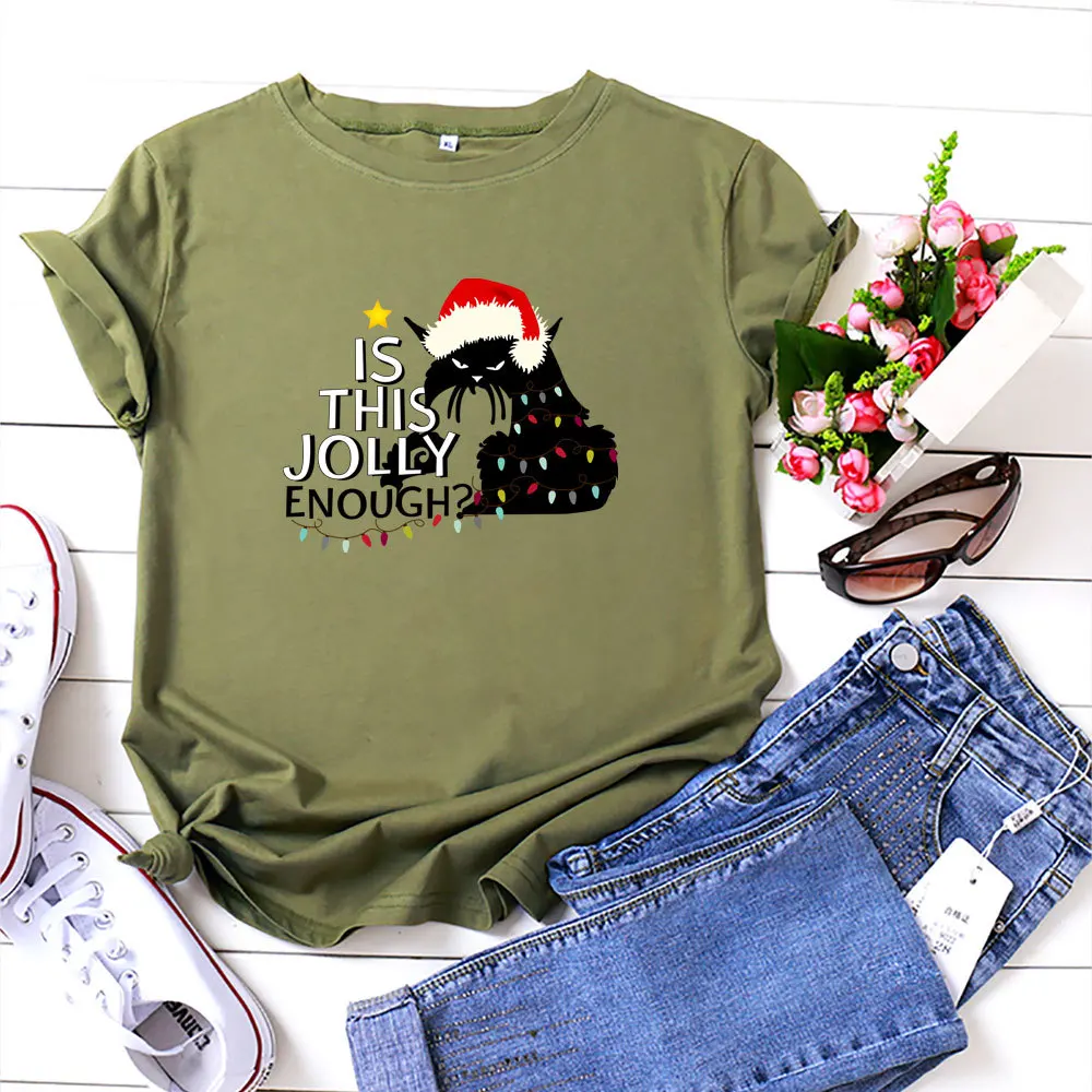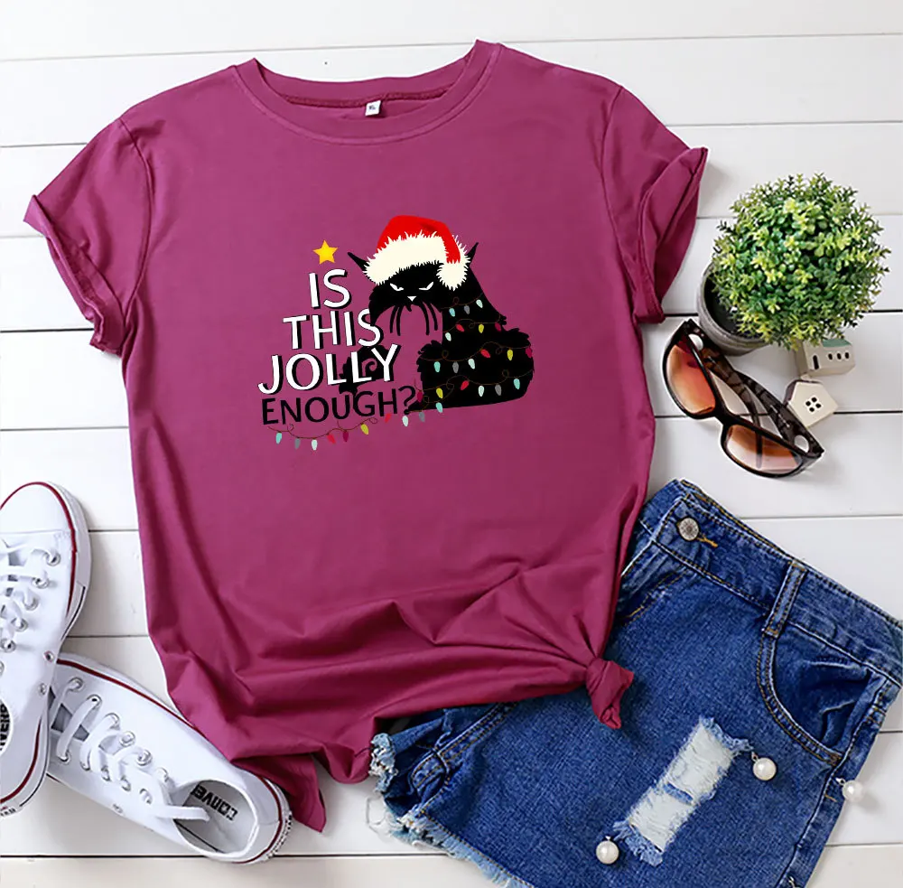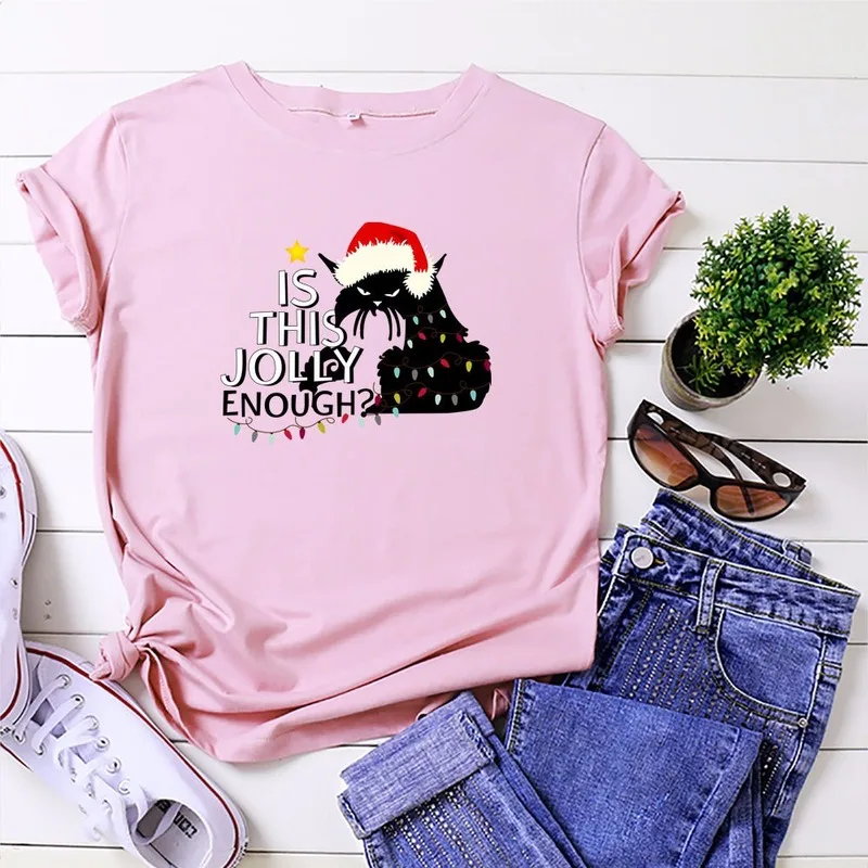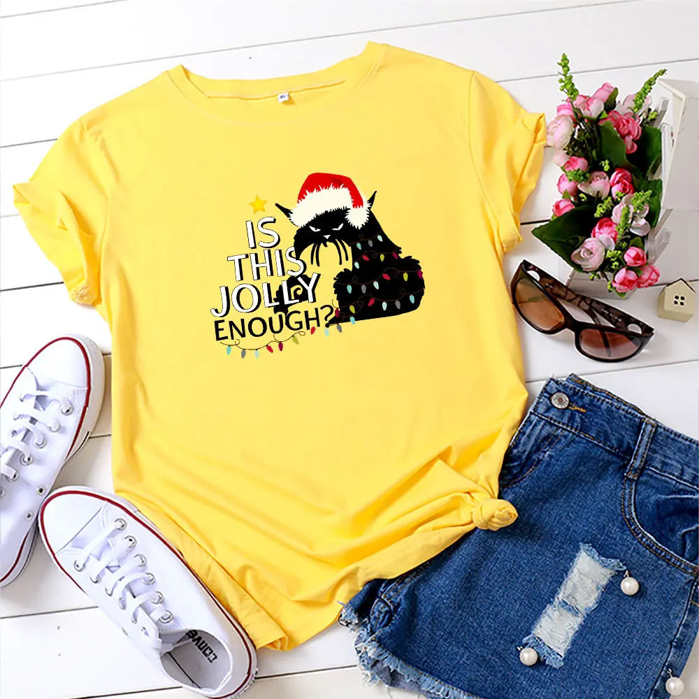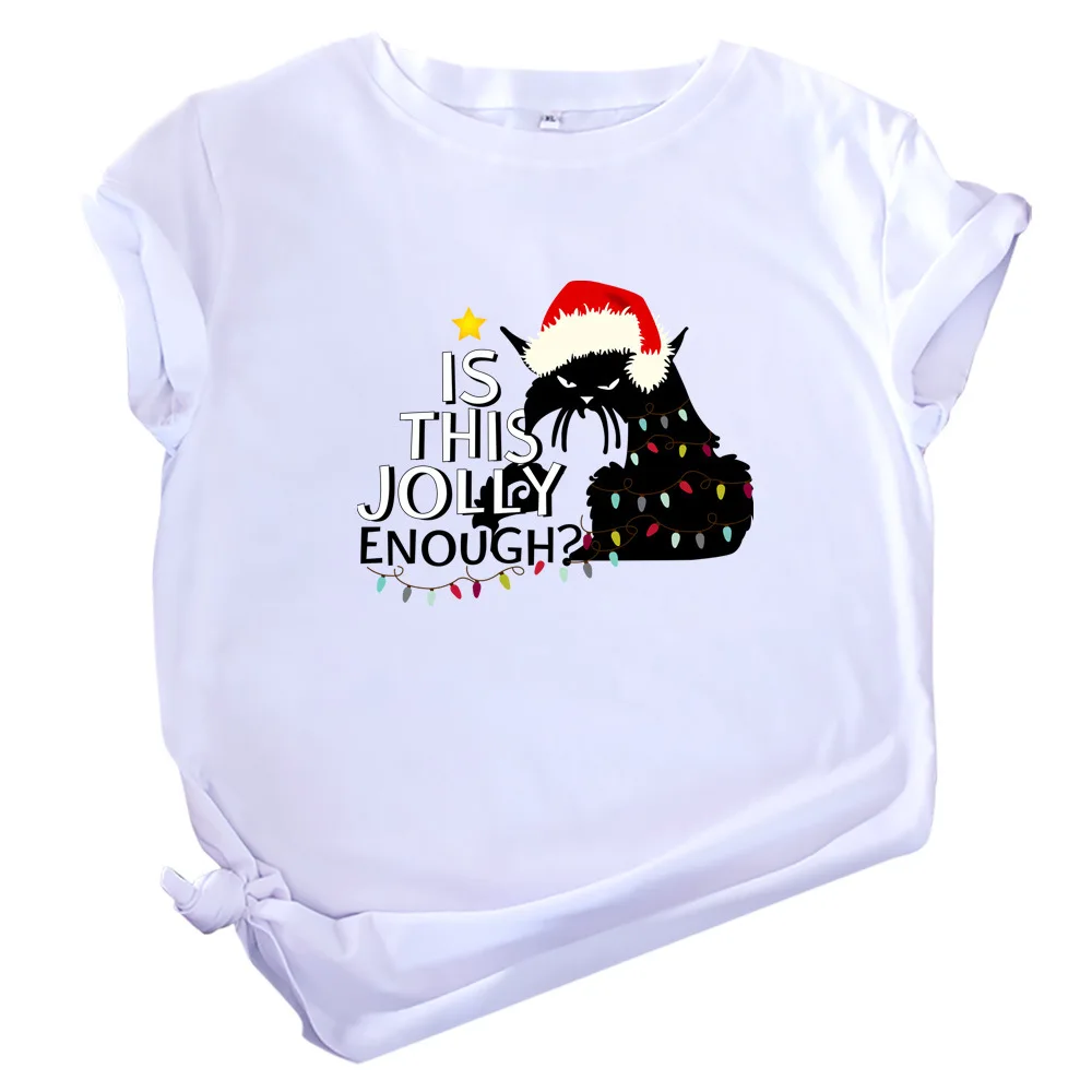 Футболка женская хлопковая с круглым вырезом, универсальная Повседневная рубашка с принтом в виде рождественских кошек и надписей, топ с коротким рукавом, размеры до 5XL, на лето