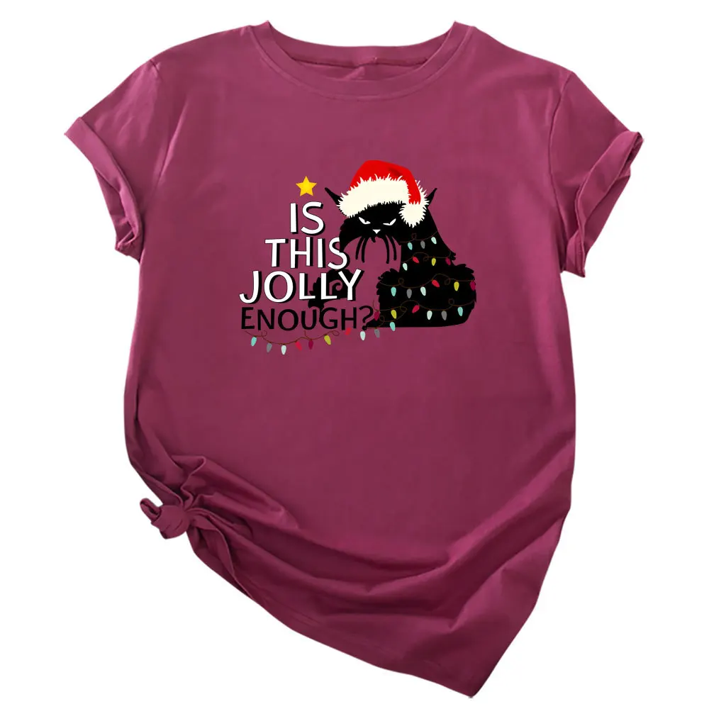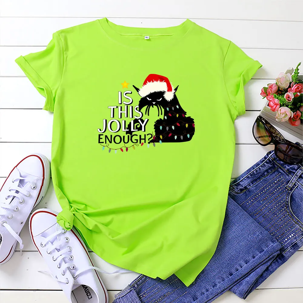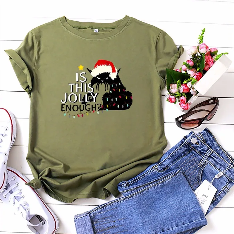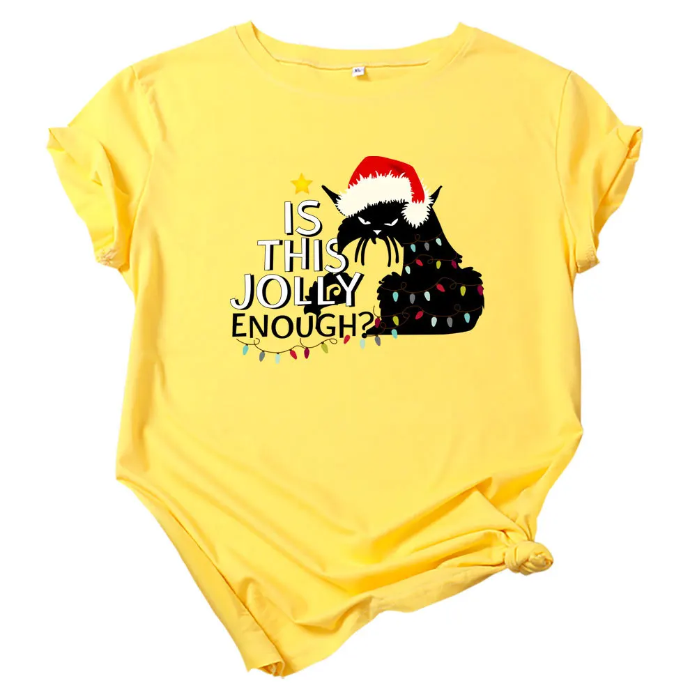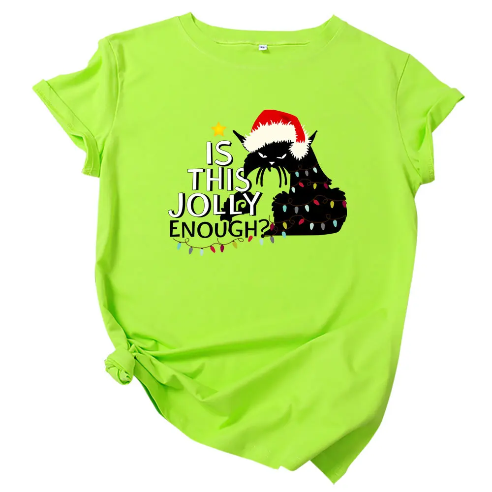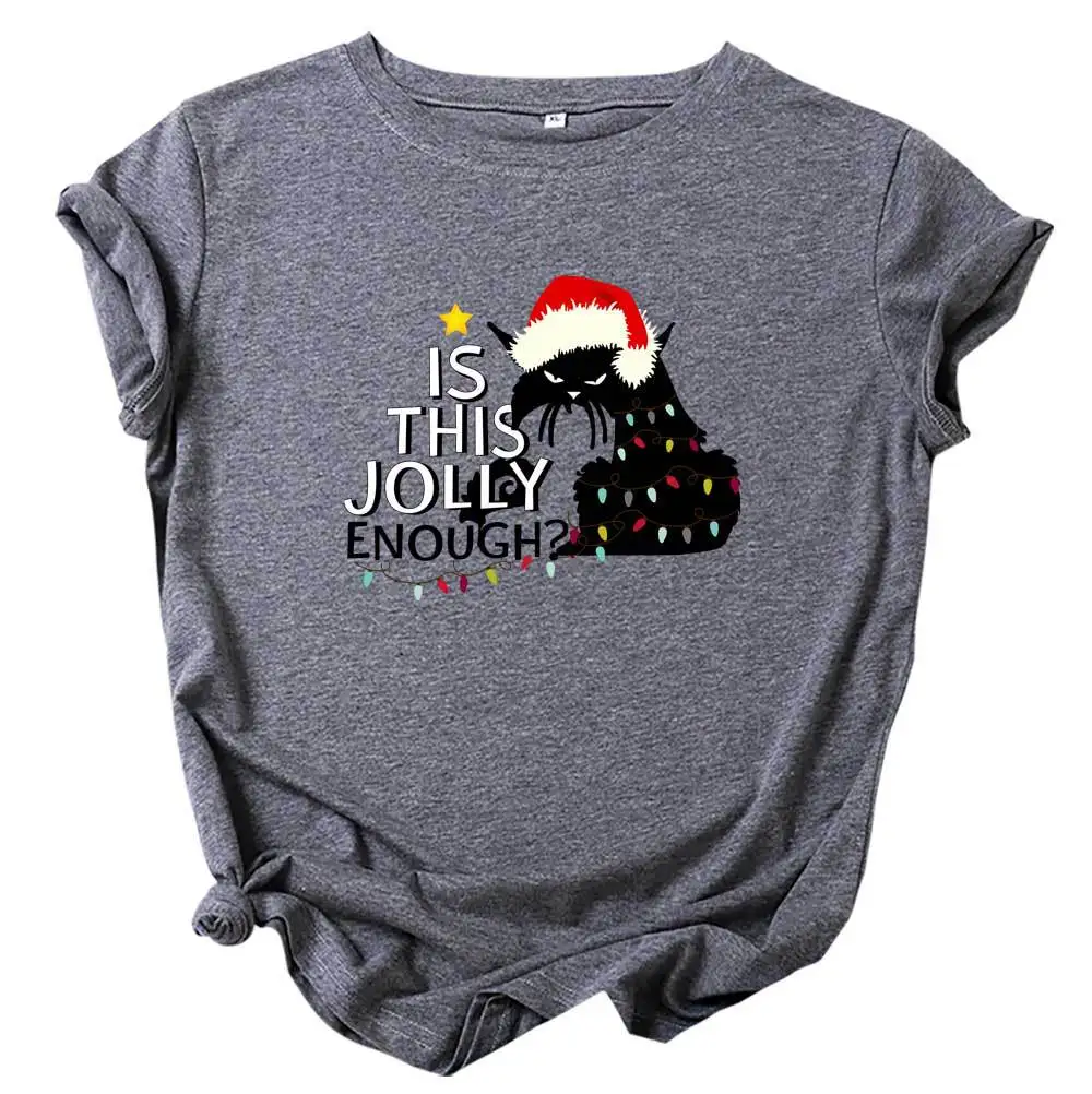 Футболка женская хлопковая с круглым вырезом, универсальная Повседневная рубашка с принтом в виде рождественских кошек и надписей, топ с коротким рукавом, размеры до 5XL, на лето