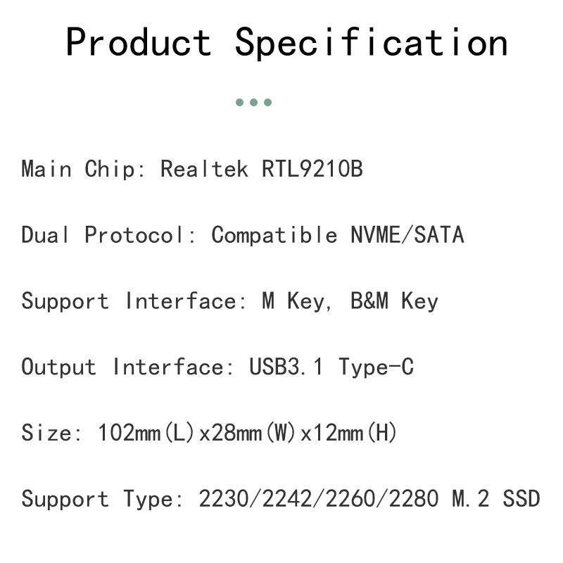 Описание:Модель с двойным протоколом 10 Гбит/с.Поддержка жёсткого диска NVME PCIe M key/M + B Key и NGFF SATA protocol B key/M + B Key SSD, С кабелем типа C-типа C 22 см и кабелем типа C-USB 3,0 22 см.Особенности:1. Корпус M.2 SATA NVME для жесткого диска USB 3,1.2. Соответствует спецификациям SATA 3 и соответствует спецификациям USB3.0.3. Поддержка протокола SATA NVME, подходит для SSD M2 (ключ B/B + ключ M/ключ M).4. Поддержка M.2 SSD, 22*30 мм, 22*42 мм, 22*60 мм, 22*80 мм твердотельных дисков (жесткие диски SSD-это не прилагаются).5. Скорость на выходе зависит от типа используемого вами SSD, SATA (6 Гбит/с), NVME (10 Гбит/с).6. Два протокола используют два вида кабелей: Type-C-Type-A (5 Гбит/с) и Type-C-Type-C (10 Гбит/с).7. Корпус из алюминиевого сплава увеличивает площадь рассеивания тепла, что облегчает рассеивание тепла жесткого диска во время работы и продлевает срок службы жесткого диска.8. Поддержка протокола UASP.9. Прост в использовании, не требует вождения.10. Конструкция пряжки без инструментов, простая установка.Спецификация:2 кабеля: USB-C для USB-A кабель + USB-C для USB-C кабельПрименение: M.2 SATA NVME 2230/2242/2260/2280 SSDЦвет: серыйМатериал: алюминиевый сплавГлавное управление: Realtek RTL9210BМаксимальная Поддержка: 2 ТБПоддержка интерфейса: B Ключ/B + M ключ/M ключВыходной разъем: Type-CСистема: для Windows 98/Se/Me/2000/XP/Vista/Win7/Win8/Win10/MAC OS 8,6 или последняя версияРазмер: 102X28X12 мм/4,02X1,1X0,47 дюймаПримечание:1. Из-за разницы в мониторах и освесветильник фактический цвет изделия может немного отлисветильник от цвета, показанного на фотографиях. Спасибо!2. Пожалуйста, допускайте погрешность в 1-3 мм из-за ручного измерения.
