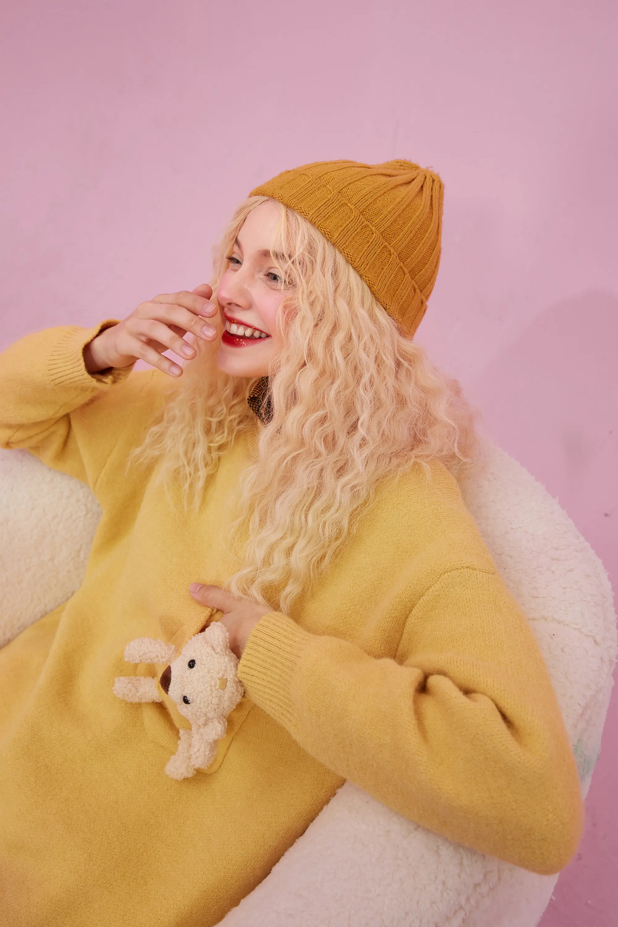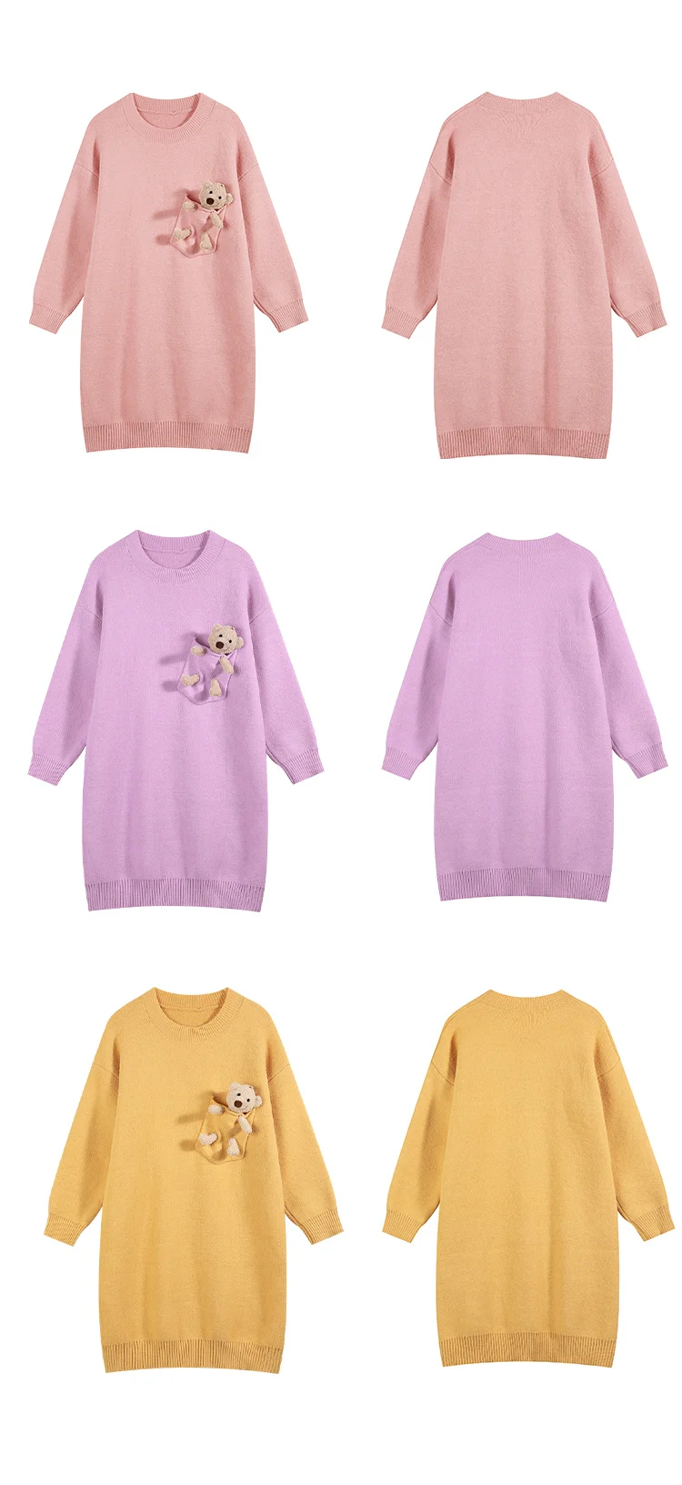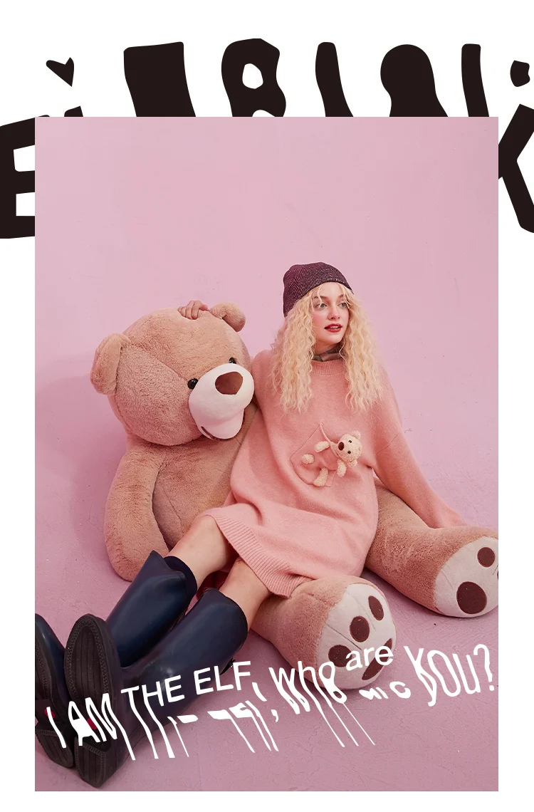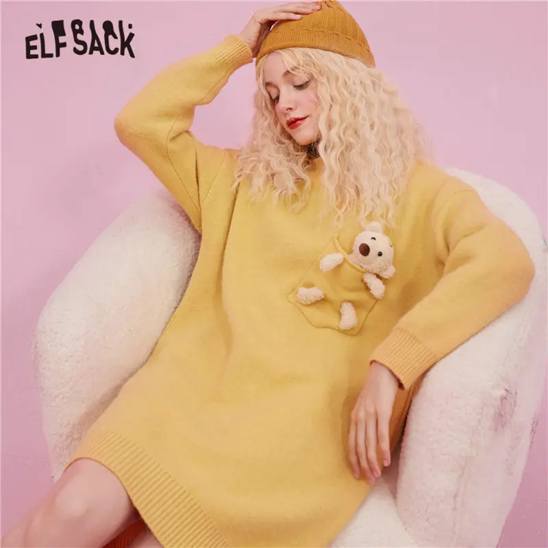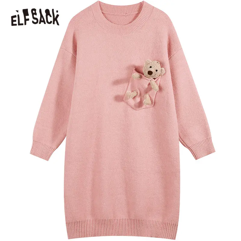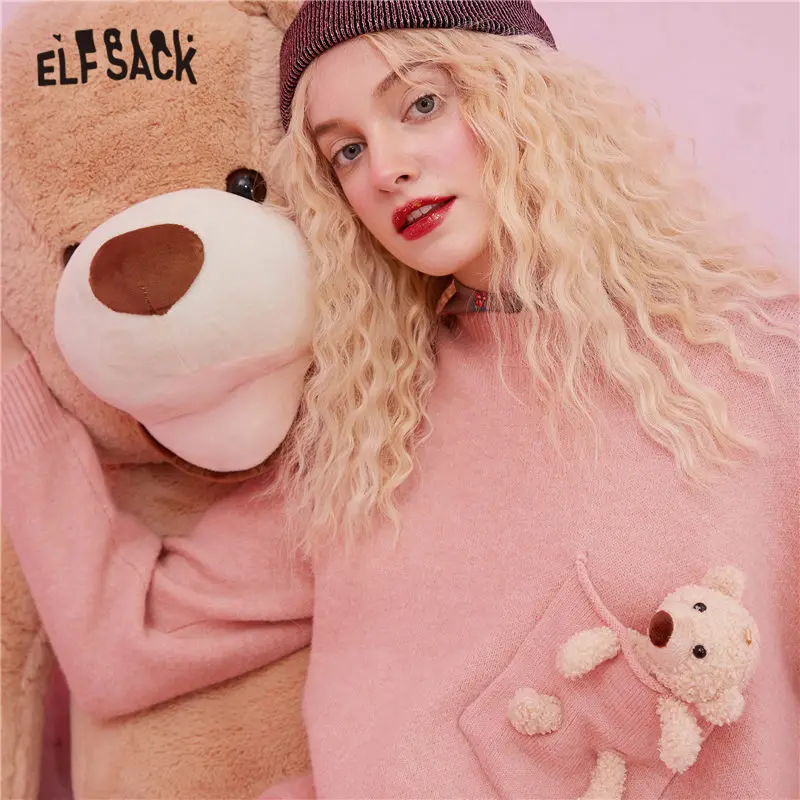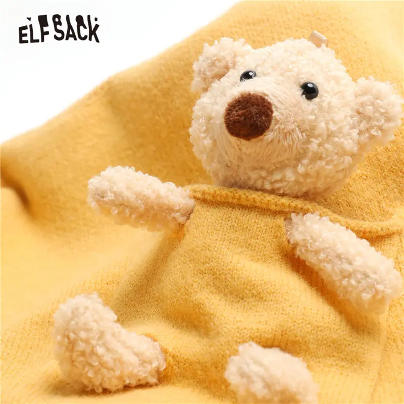 Женский Повседневный пуловер ELFSACK, однотонный пуловер с длинными рукавами и рисунком медведя, вязаные свитера, осень 2020, повседневные милые топы ELF в Корейском стиле