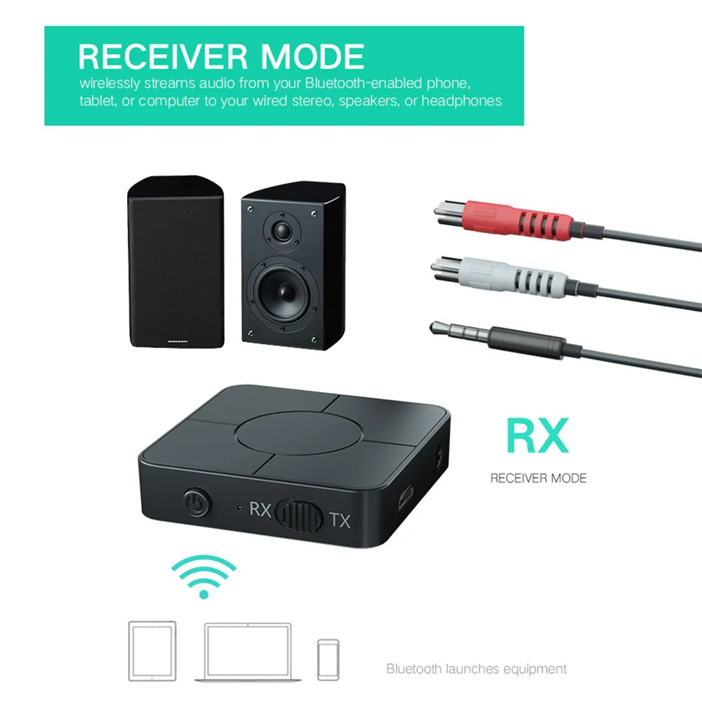 4. Переключитесь между режимами передатчика и приемника одним простым щелчком переключателя. Легкое подключение с помощью передовой технологии Bluetooth и аудиокабеля 3,5 мм (входит в комплект).