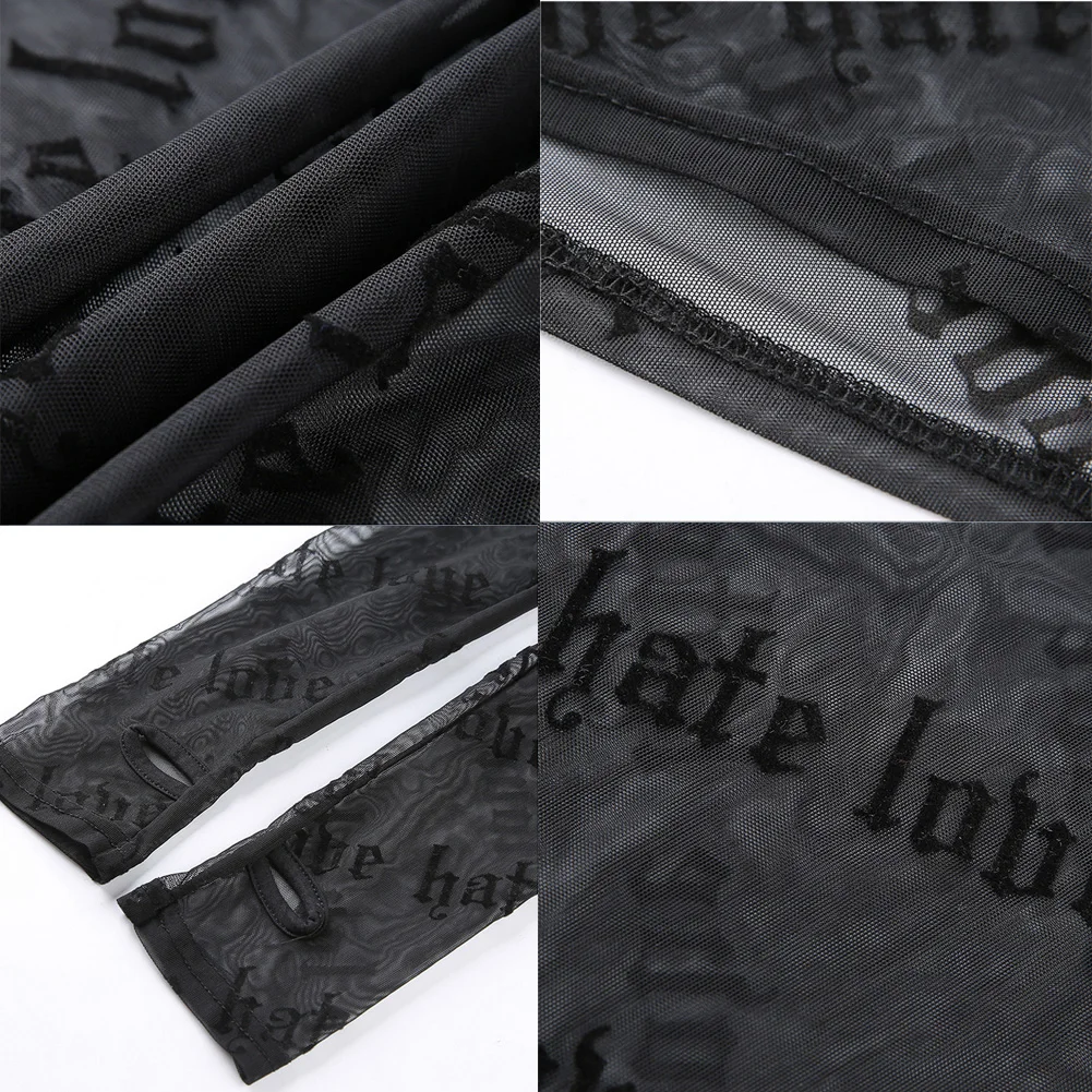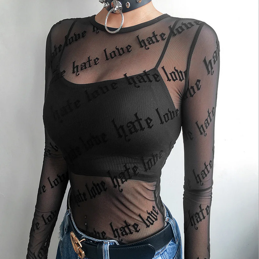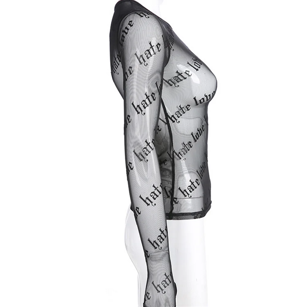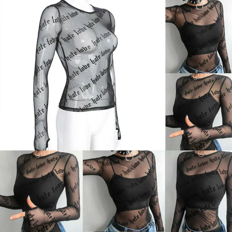 Пляжная одежда, накидка на бикини, женские сетчатые прозрачные пикантные Топы с длинным рукавом, черная футболка с принтом, блузка
