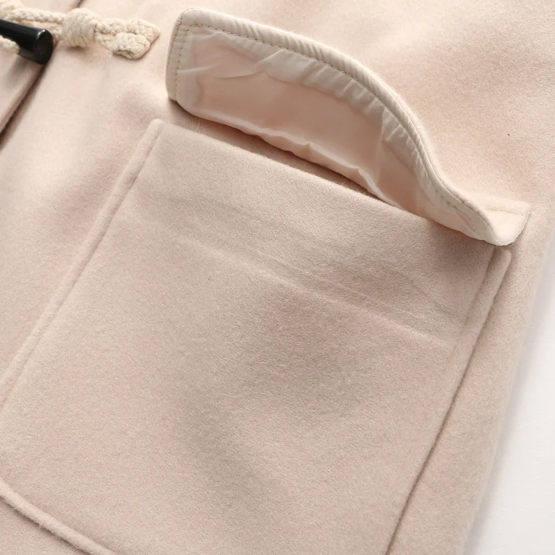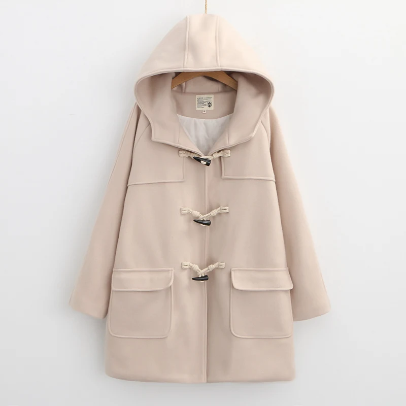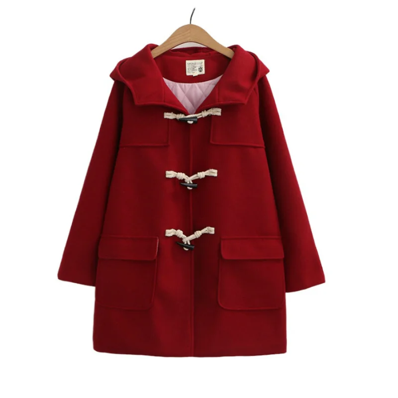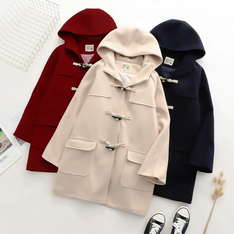 Однотонное женское длинное шерстяное пальто 2021, зимнее свободное теплое пальто с капюшоном, шерстяное пальто для офиса и работы, леггинсы с роговыми пуговицами