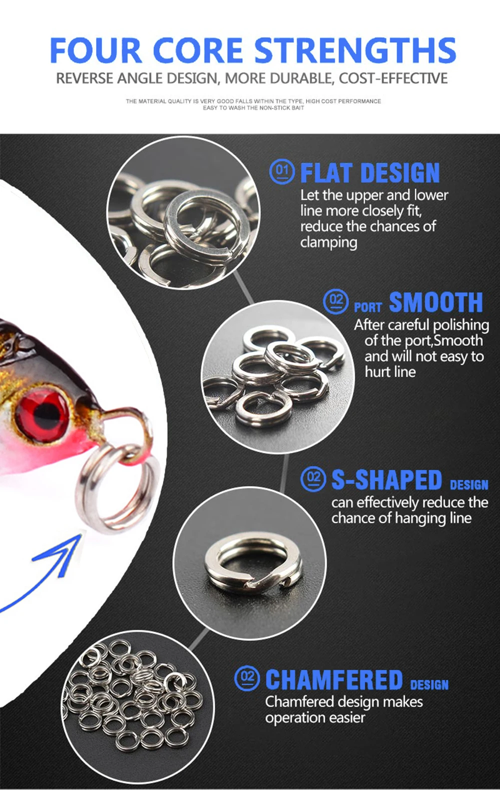 Изготовлен из высококачественного материала из нержавеющей стали. Высокая прочность на растяжение и коррозионная стойкость. Угловой отрезать, сделать сборку более эффективной. Кольцо уменьшено, улучшает производительность приманки, не мешая крючкам.