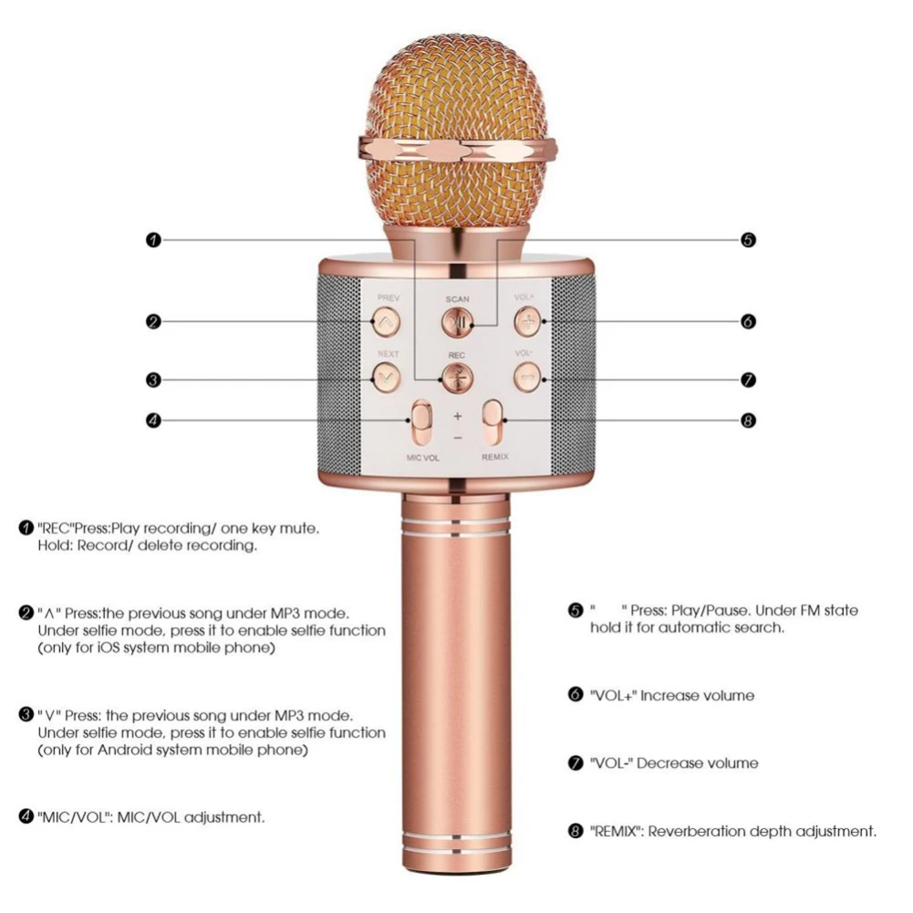 Беспроводной Bluetooth караоке KTV музыкальный Поющий микрофон динамик домашний караоке микрофон беспроводной Характеристики: Это волшебный микрофон и Bluetooth колонка, которая позволяет петь песни и воспроизводить песни. Простота в эксплуатации: Нет необходимости в каких-либо драйверах, вы можете петь без какого-либо проводного подключения в любое время, в любом месте. Отличное качество звука: настоящий низкий уровень шума, высокая точность, чистый и нежный звук. Поддерживает Системы Android/iOS. Название товара: Bluetooth-микрофон Материал: металл Звукосниматель: конденсатор Режим реверберации: эхо-реверберация Выходная мощность: 5 Вт Диапазон воспроизводимых частот: 100 Гц-10 кГц Напряжение зарядки: 5 В Аудиоинтерфейс: разъем 3,5 мм Время зарядки: около 3-5 часов Время воспроизведения: около 5-8 часов (полностью заряжен, средняя громкость) Аккумулятор: литиевая батарея 1800 мАч (входит в комплект) Особенности: портативный, беспроводной, Bluetooth-соединение, с динамиком Размер: 24,5 см x 7 см x 7 см/9,65 дюйма x 2,76 дюйма x 2,76 дюйма (прибл.) Примечания: Из-за разницы в освещении и настройках экрана цвет товара может сильно отличаться от изображений. Замеры сделаны вручную, поэтому возможны незначительные отклонения в размерах. Посылка входит: 1 микрофон Bluetooth 1 x USB-кабель 1 x Руководство пользователя