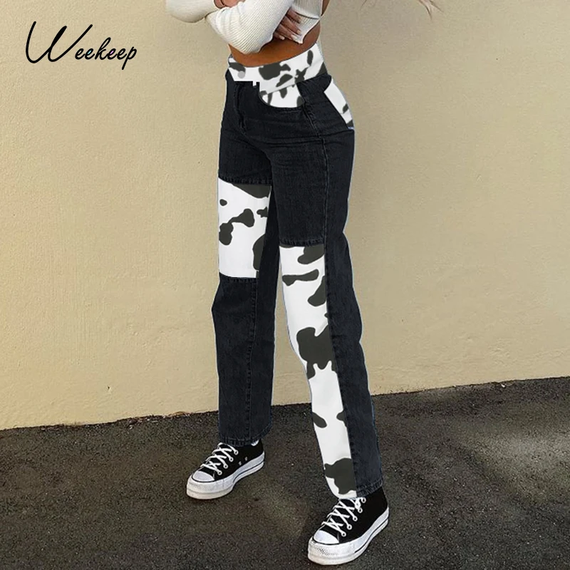 Weekeepбрюки-карго с нашивкой в стиле панк, прямые джинсы, женские винтажные уличные джинсовые брюки с высокой талией, повседневные корейские Капри с принтом коровы