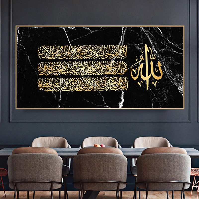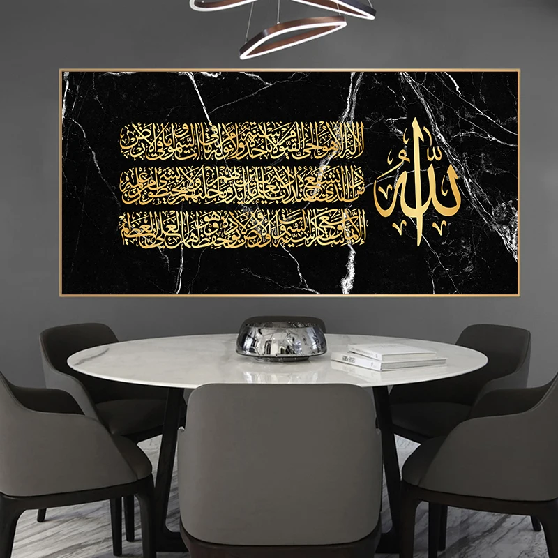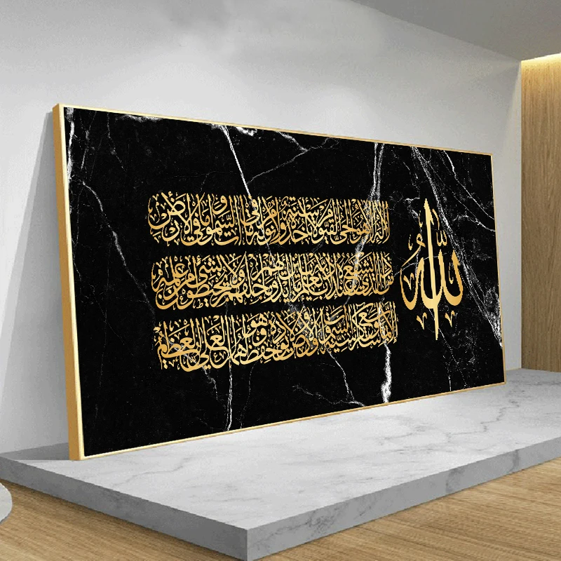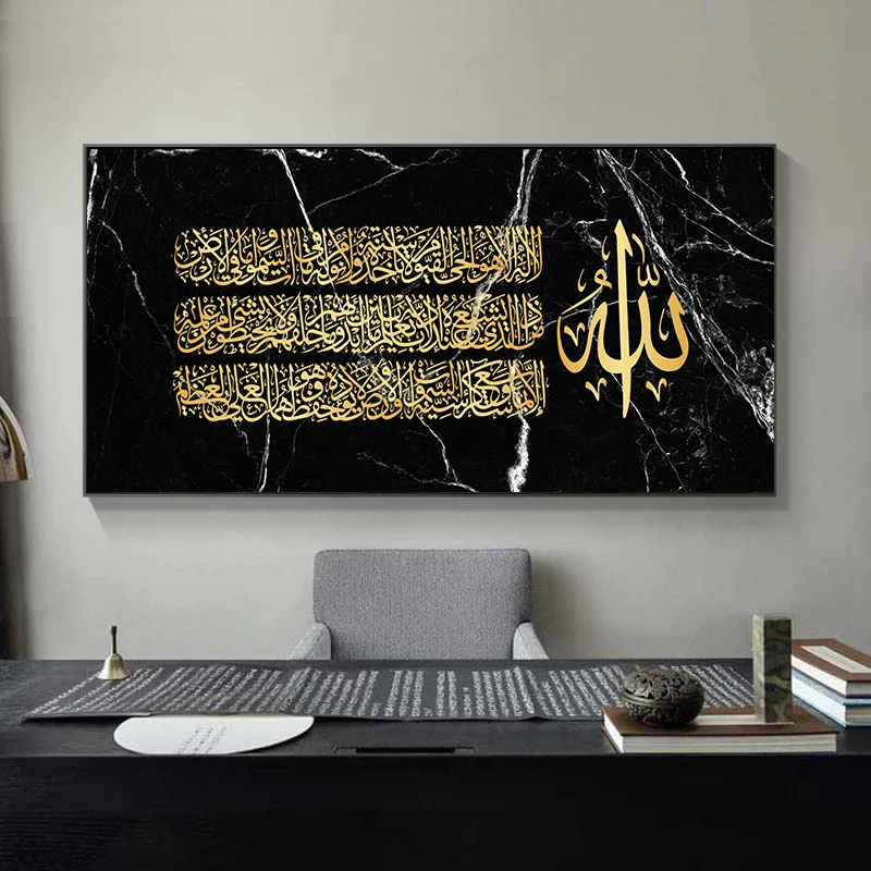 Черный Мраморный фон Золотой исламский арабский Коран Каллиграфия плакат и печать холст настенное искусство для мусульманского домашнего декора