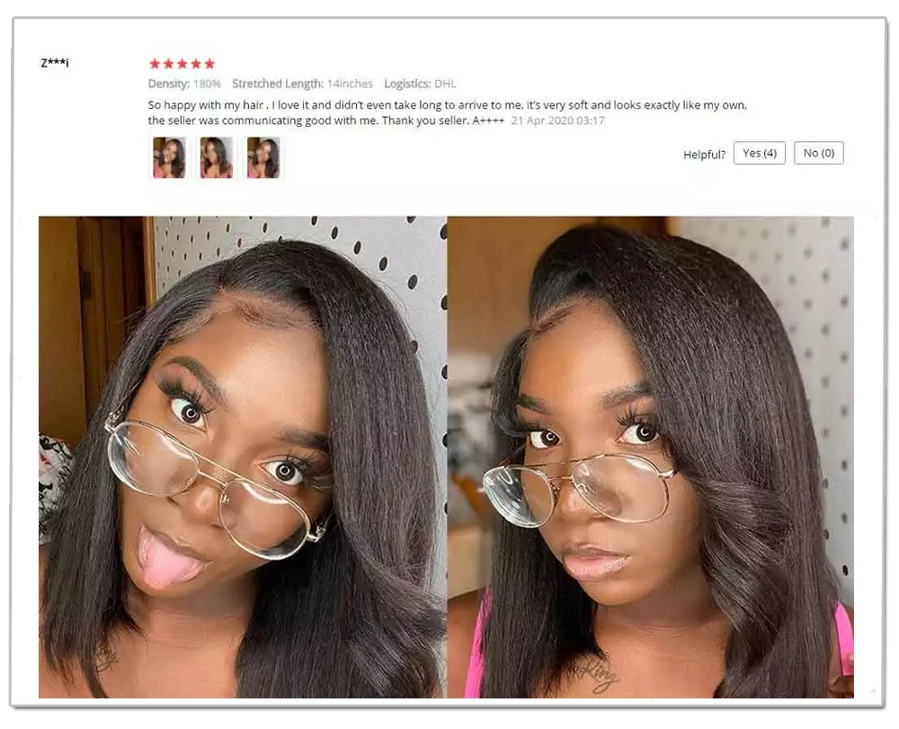 Я был очень доволен своей покупкой. Все было точно так же, как описано. Волосы мягкие, и длина, которую я купил. Парик предварительно выщипывается с волосами ребенка, который выглядит так естественно! Я буду заказывать больше у этой компании. Обслуживание клиентов потрясающее. Спасибо