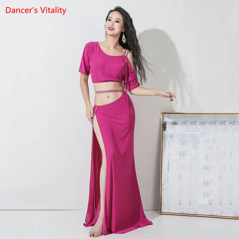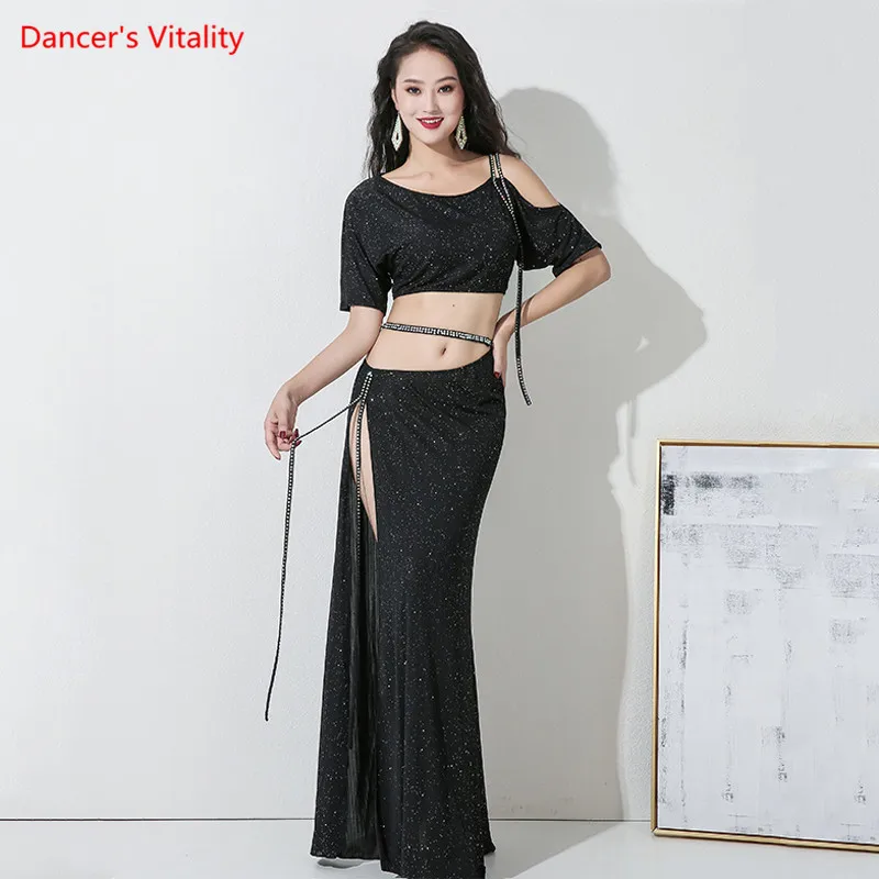 Костюм женский для восточных танцев, топ с блестками и юбка с длинным рукавом и разрезом, тренировочный костюм с высокой талией для взрослых