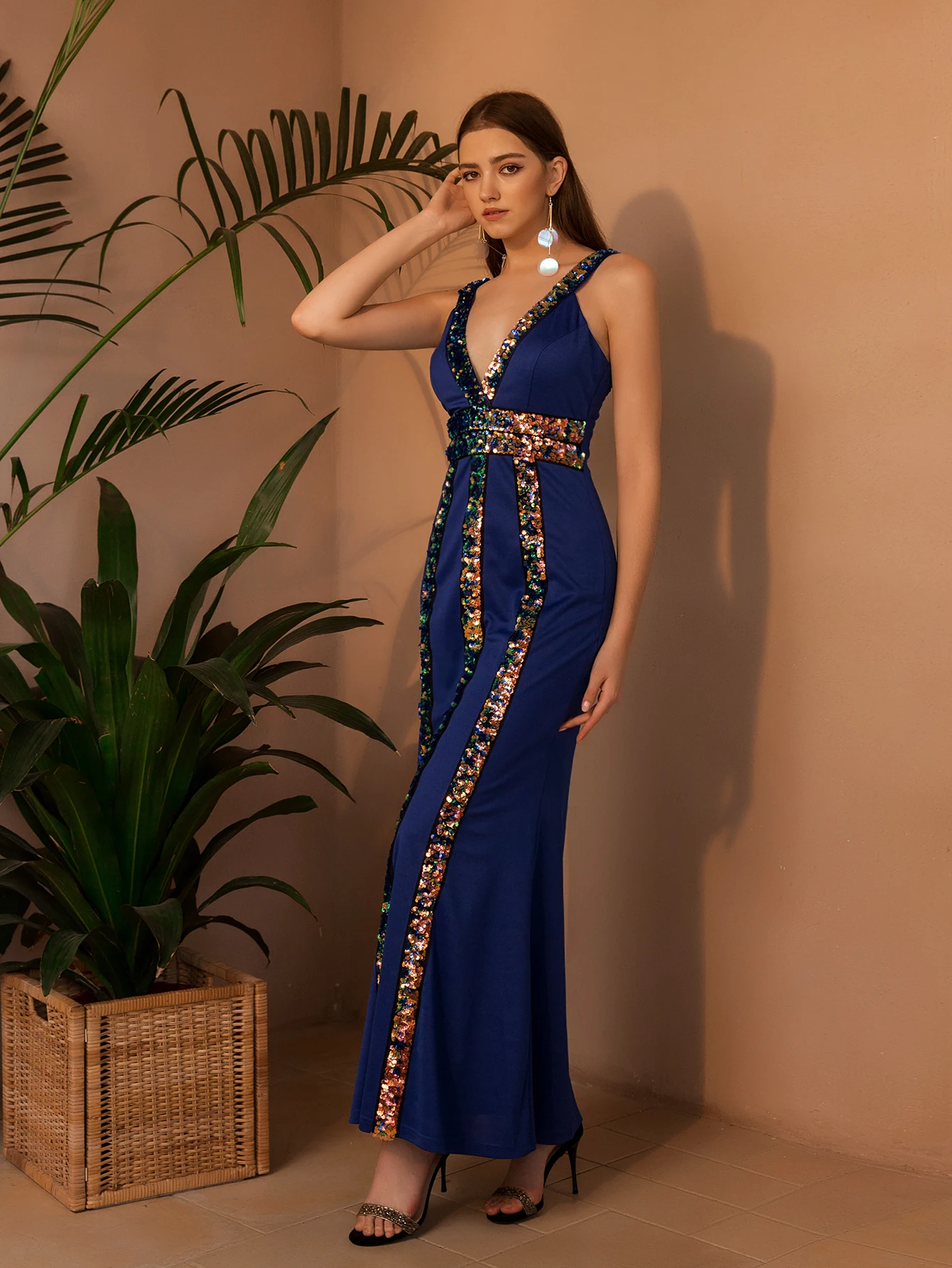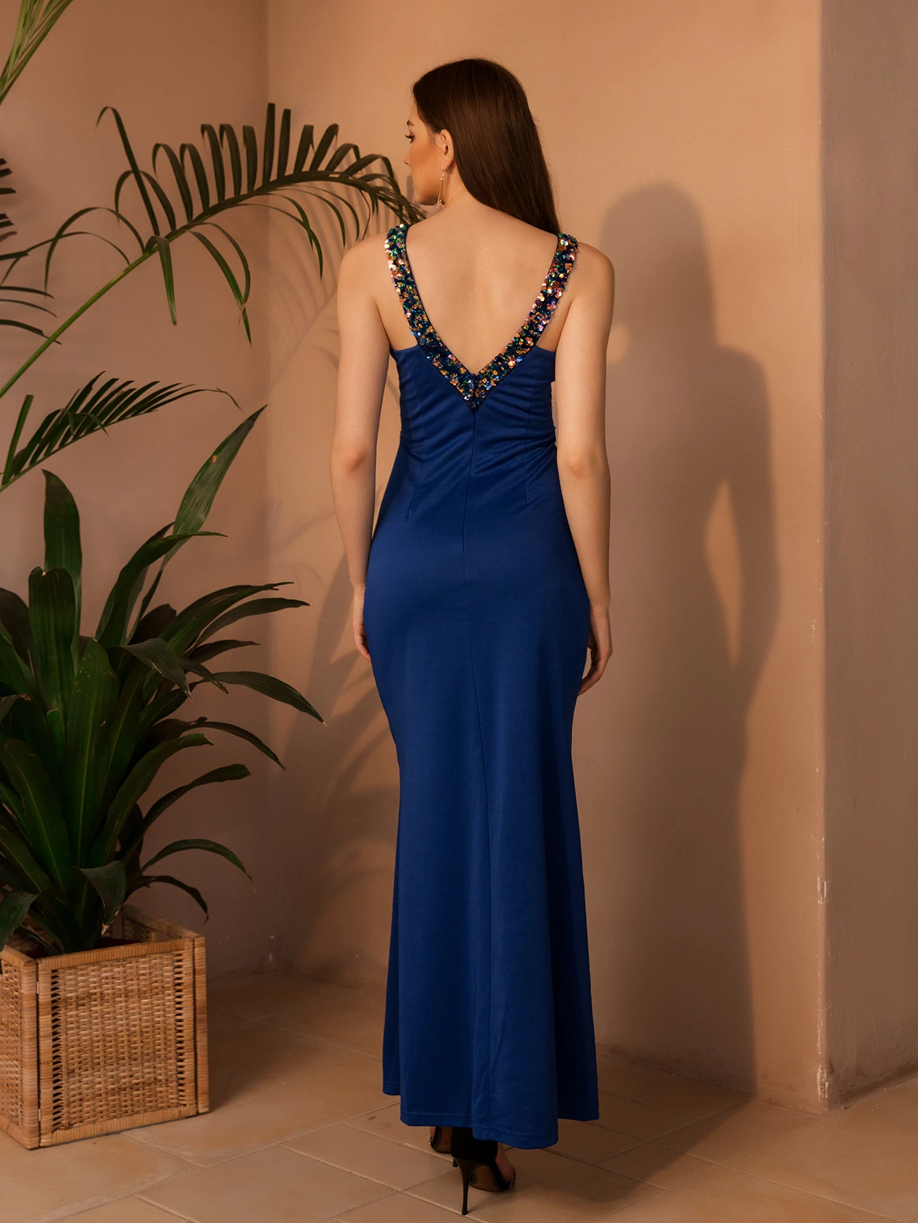 Женское платье с V-образным вырезом и блестками Angel-fashions, синее длинное платье для выпускного вечера, 553