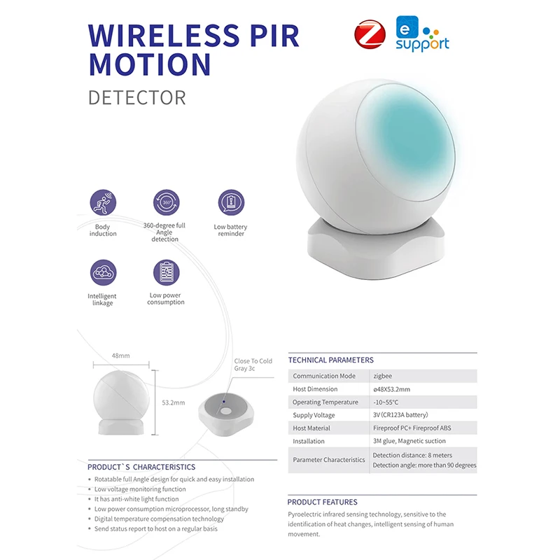 Примечание:Продукт должен использоваться с шлюзом Ewelink zigbee и не может использоваться отдельно.Особенности:1. Измерьте движение.2. Легко установить на стену или любую поверхность с помощью винтов или ленты.3. Тип батареи: CR123A x 1.4. Ток в режиме ожидания: 26uA, Ток тревоги: 120mA-130mA.5. Срок службы батареи: 2500 триггеров (1 триггер 7 раз в день, 2 триггера 3 раза в день).6. Чувствительное расстояние: 6 метров.7. Угол обзора: 110 градусов.8. Рабочая температура: 0 °C ~ 40 °C (32 °F ~ 104 °F)Рабочая влажность: 20% ~ 85%Температура хранения: 0 ℃ ~ 60 ℃ (32 °F ~ 140 °F)Спецификация:Рабочая tamperature: 0 ℃ ~ 40 ℃Рабочая влажность: 20% ~ 85% относительной влажностиМетод подключения: Zigbee 802.15.4Материал: PC + ABSОперационная система: Для iOS8.0/Android 4,0 и вышеРазмер изделия: около 48*482*53 ммВес: около 100 гЦвет: белыйУпаковочный лист:1 * датчик движения PIR (встроенный аккумулятор)1 * Руководство пользователя