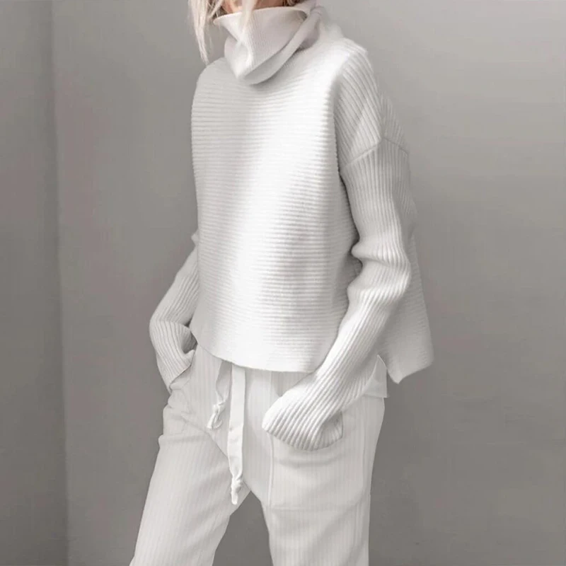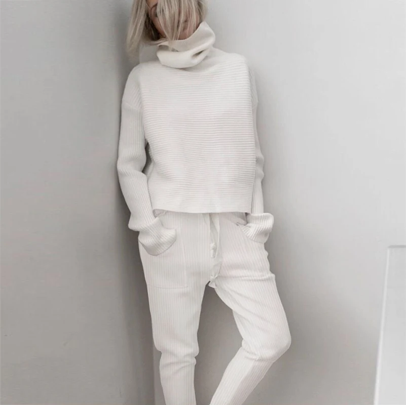 Женский трикотажный комплект из 2 предметов, элегантный топ с длинным рукавом и высоким воротником и штаны, повседневный спортивный костюм свободного кроя, Осень-зима