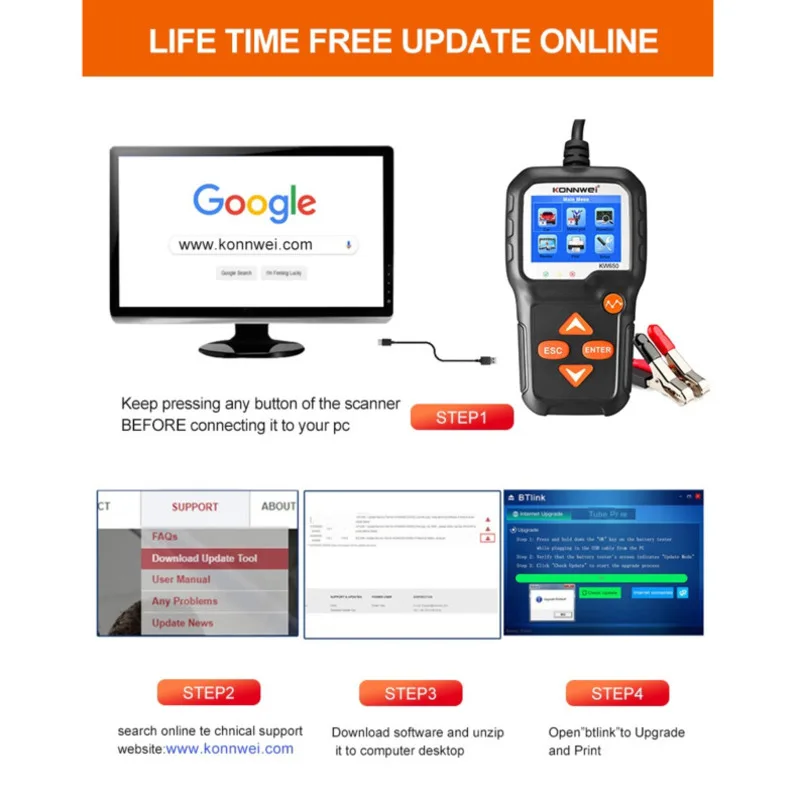 Примечание: Этот продукт может протестировать батареи всех автомобилей 6v-12v, мотоциклов, газонокосилок и других продуктов. Он поддерживает 12 национальных языков и может быть обновлен онлайн бесплатно: http://www.konnwei.com; Он может напечатать код неисправности автомобиля с помощью компьютера.