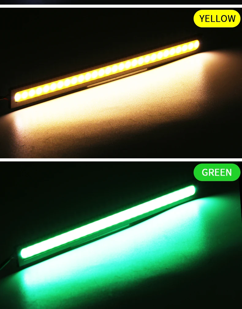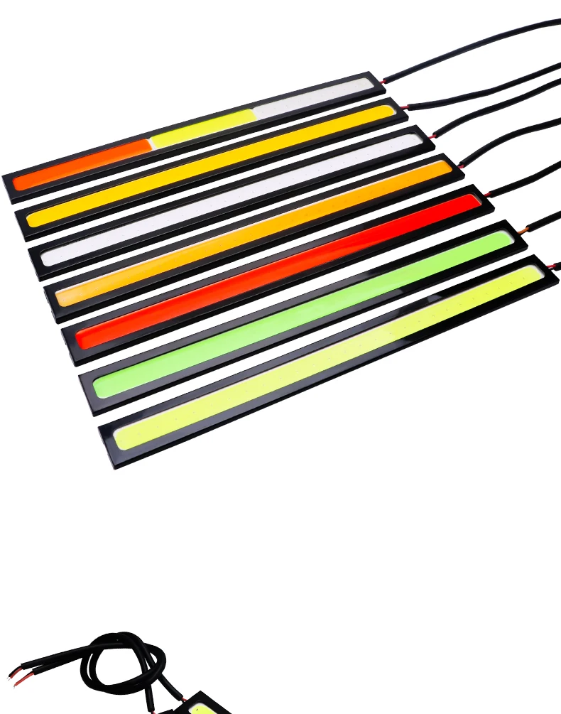 Характеристики: Мощность: 3,84 Вт каждая штукаВходное напряжение: DC10V-12VМатериал: пластик и металлЦвета: белый/синий/голубой/красный/желтый/зеленыйЦветовая температура: 6000K-8000KПрименение автомобиля: УниверсальныйВес нетто: 14 гРазмер: 17,4 см x 1,5 см x 0,5 см (Д x Ш x В)Срок службы: 100000 часов Посылка: 1x COB светодиодные дневные ходовые огни
