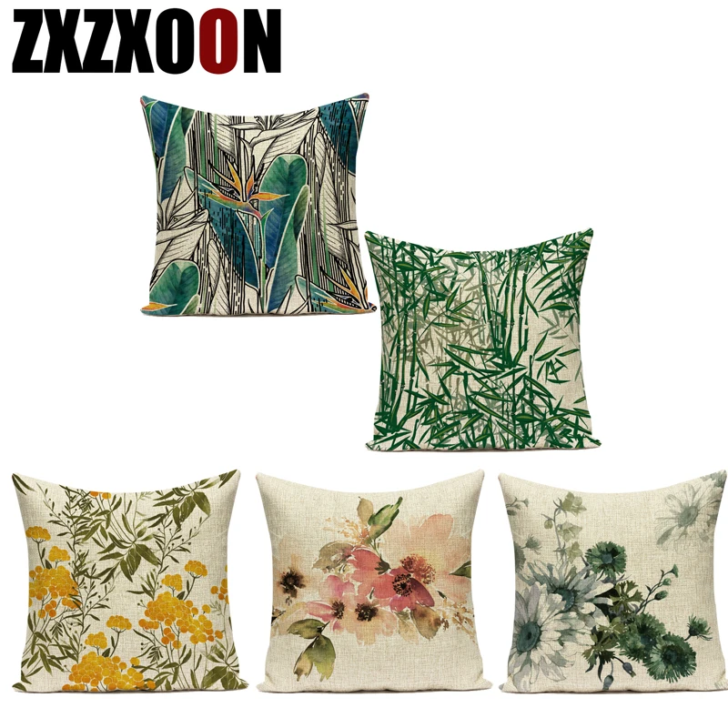 Декоративный чехол для диванных подушек, наволочка с зелеными тропическими пальмами, бамбуковыми цветами, диванами, украшение для гостиной