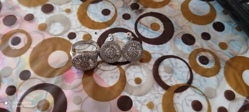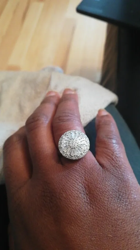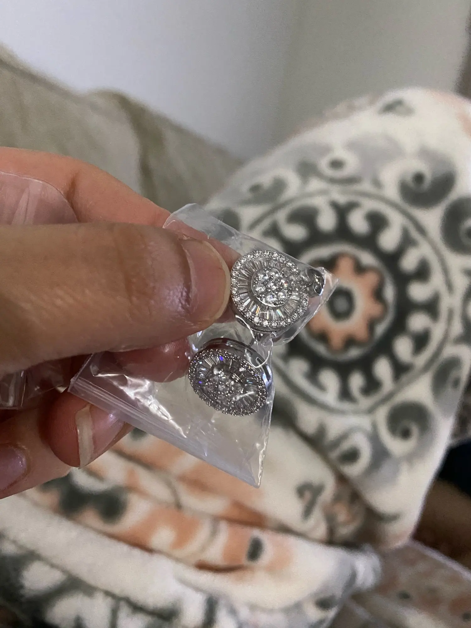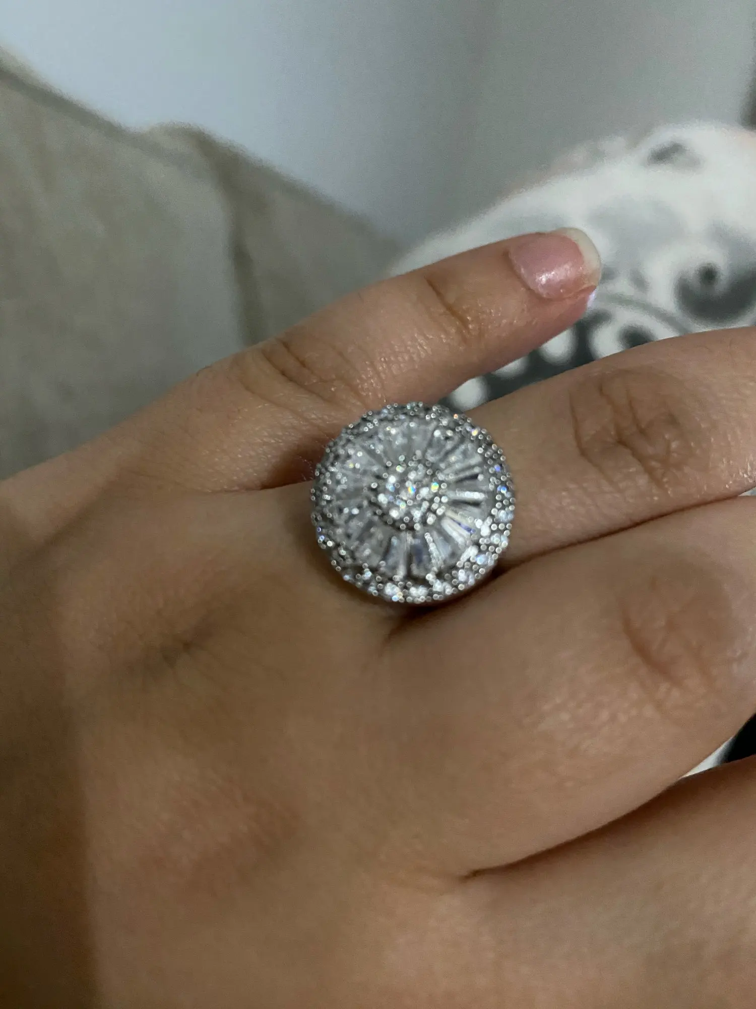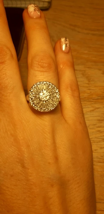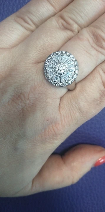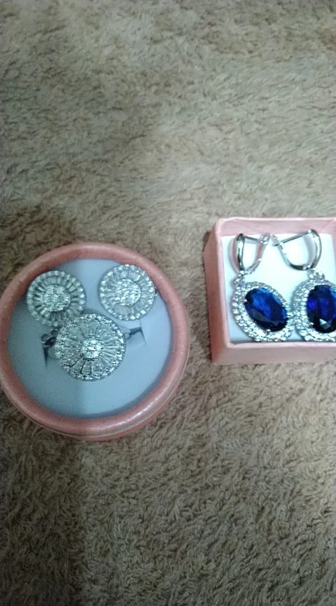 Пришли в сборной посылке в подарочной коробочке. Есть небольшой дефект металла на кольце, а серьги немного отличаются от кольца. Серединка больше по размеру, а камни вокруг как утоплены ниже средины, на кольце все камни на одном уровне.