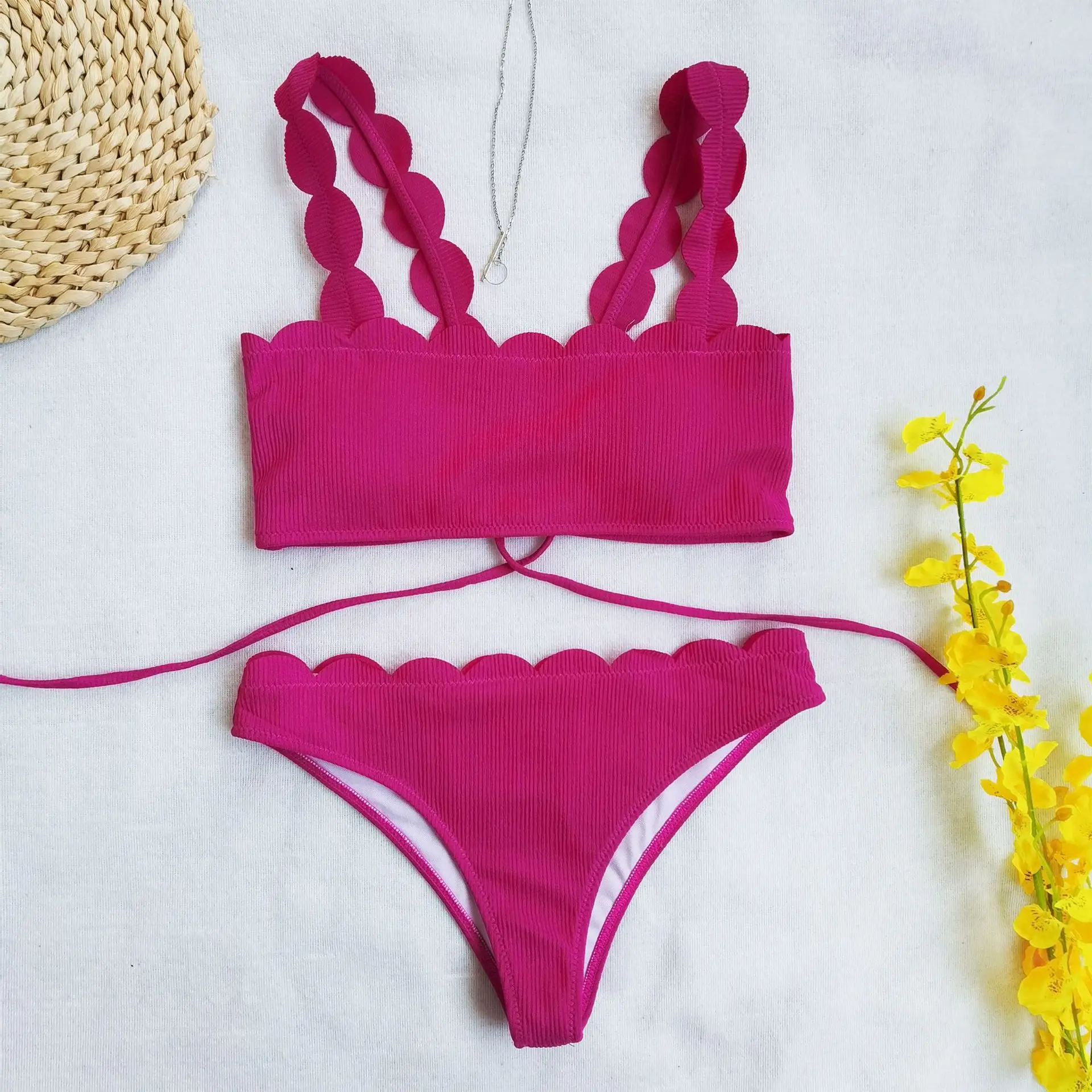 Купальник женский волнистый бикини 2020 сплошной цвет Холтер пляжная одежда бандаж купальный костюм женский сексуальный низкая талия бикини с вырезом набор
