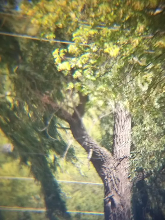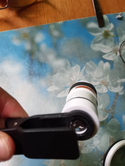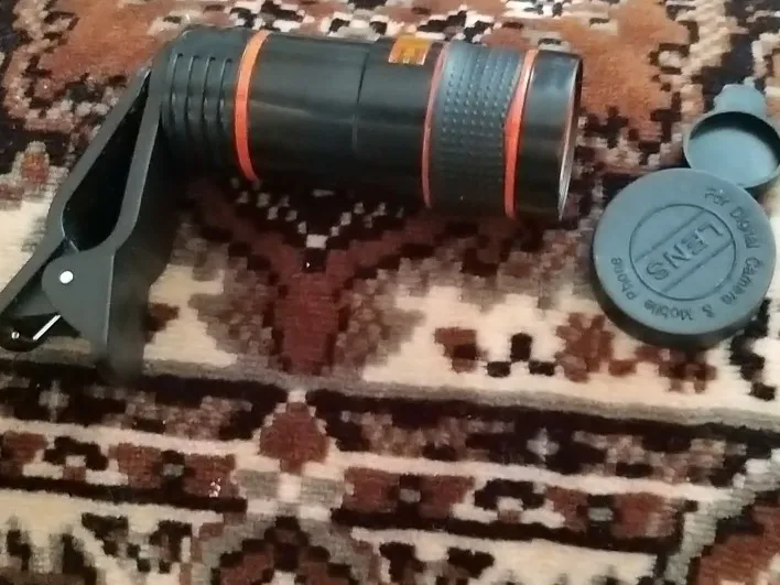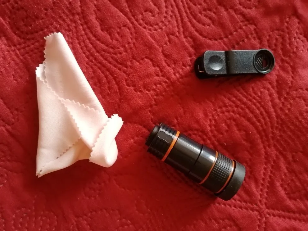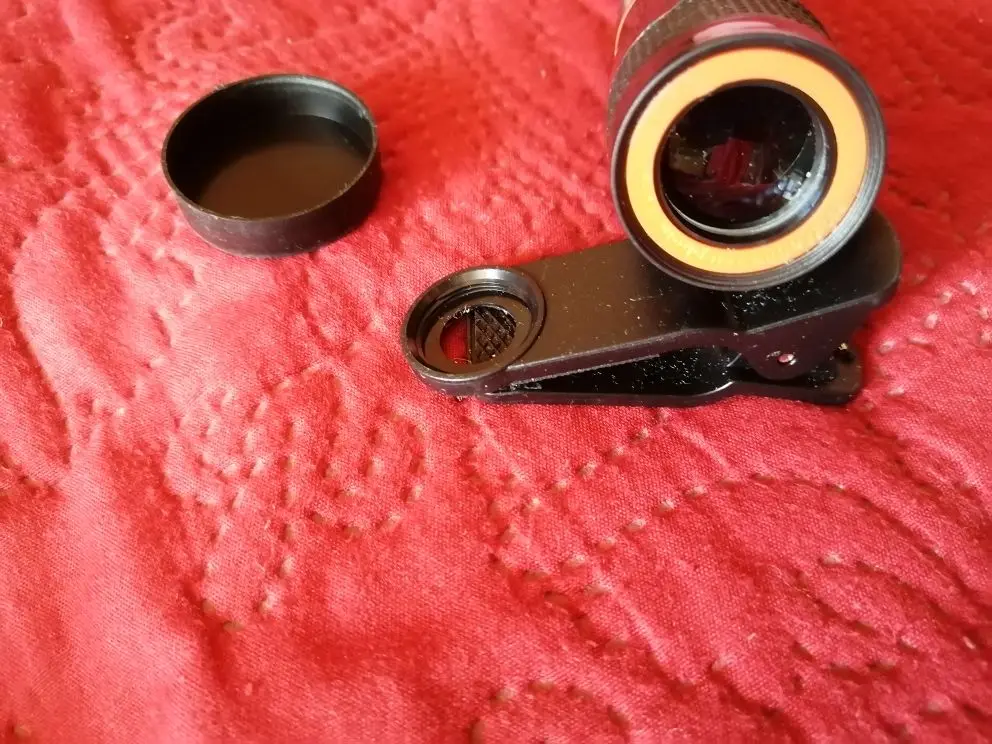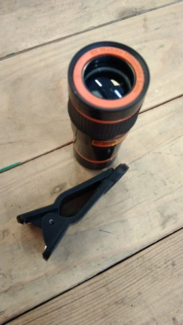 На окуляре съёмная крышечка (не потерять бы её), на объективе крышечки нет. Объектив можно подвинуть на 4 мм, настроить резкость. Телескопик в прищепку вворачивается, держится, прищепка достаточно тугая и сделана так, что смартфон не царапает. Мне было сложно разместить телескопик точно на камеру смартфона, и сложно наводить на объект при фотосъёмке. На фото деревья без телескопа, без телескопа при максимальном приближении и с телескопом. Угол обзора маленький, конечно, но за эти деньги неплохо.