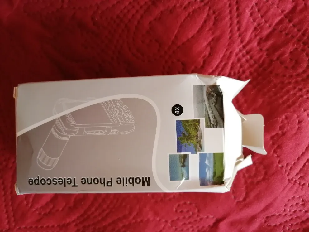 Коробка была очень помятая. Объектив работает, кольцо фокуса немного тугое, двигается вместе с объективом на телефоне.