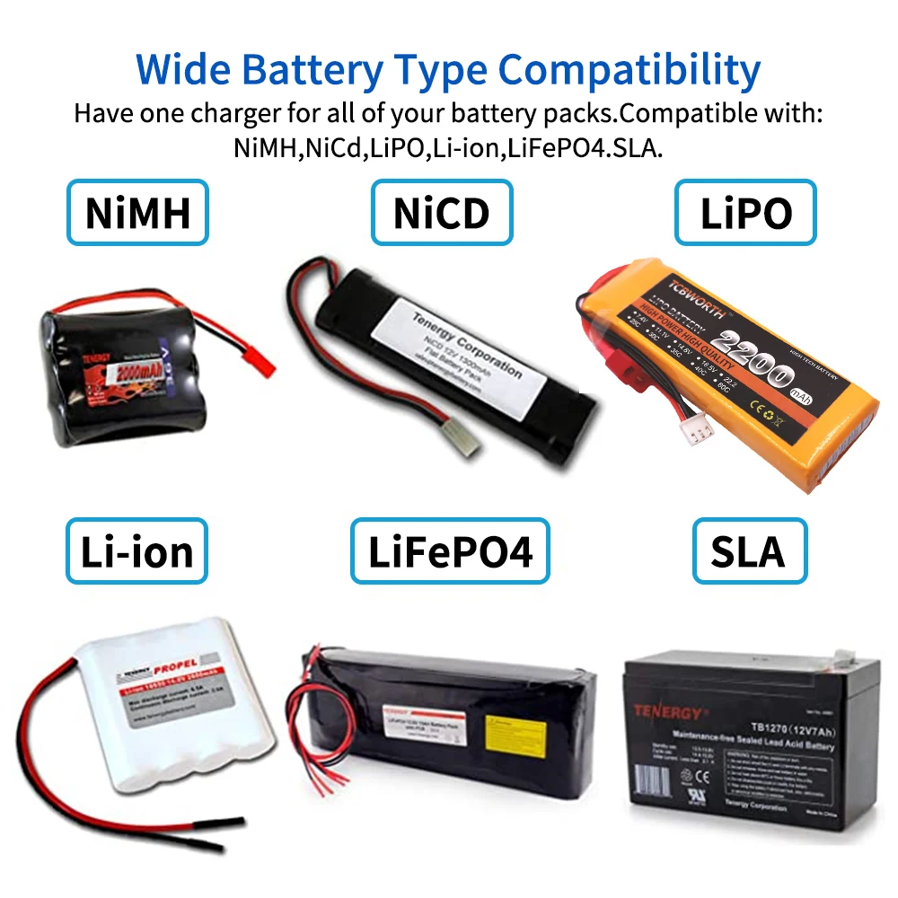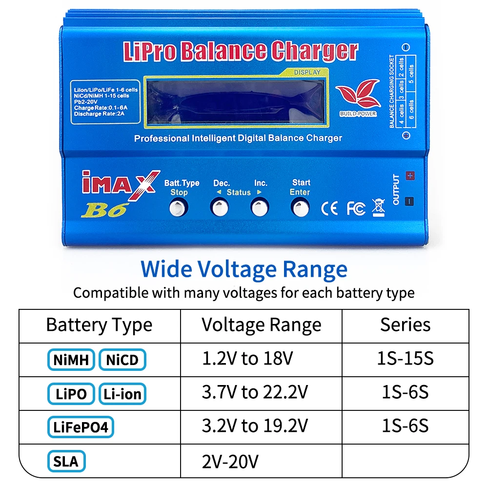 80 Вт 6A баланс зарядное устройство с высокой производительностью микропроцессора Может заряда и разряда в различные батареи, такие как 1,2 в-18 в никель-металл-гидридного/гидридных и никель-кадмиевых типов аккумуляторов (1-15 ячеек), 3,7 V-22,2 V LiPo/Li-Ion батареи (1-6 ячеек), 3,2 V-19,2 V LiFePO4 батареи (1-6 ячеек) и 2V-20V SLA батареи. Примечание: Не выбирайте неправильный тип аккумулятора при зарядке.