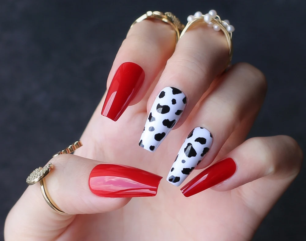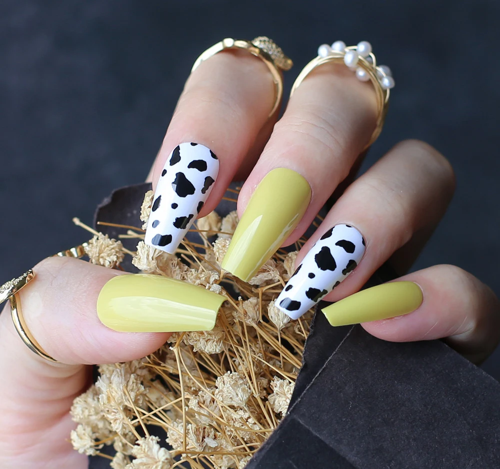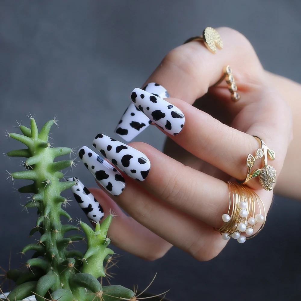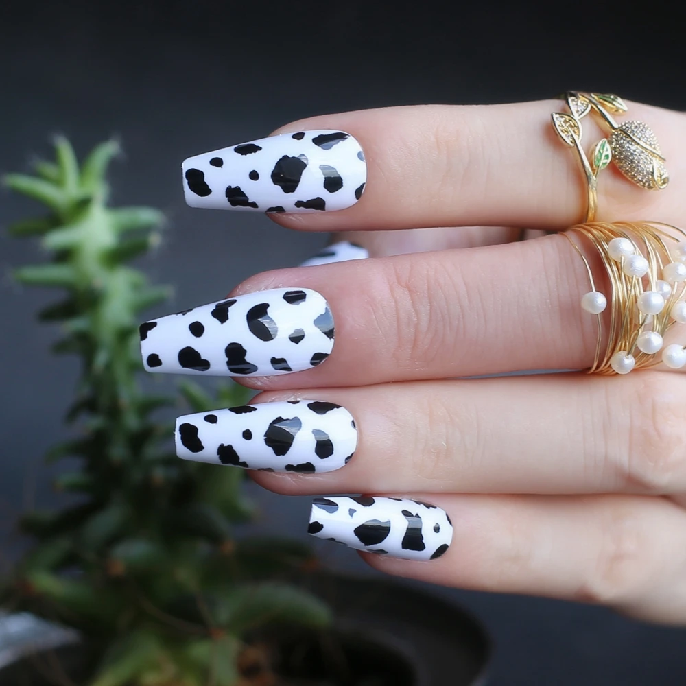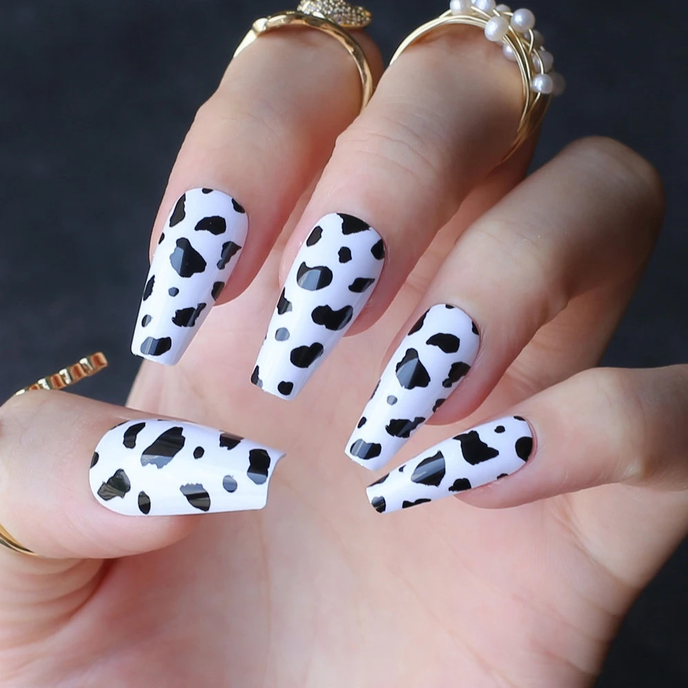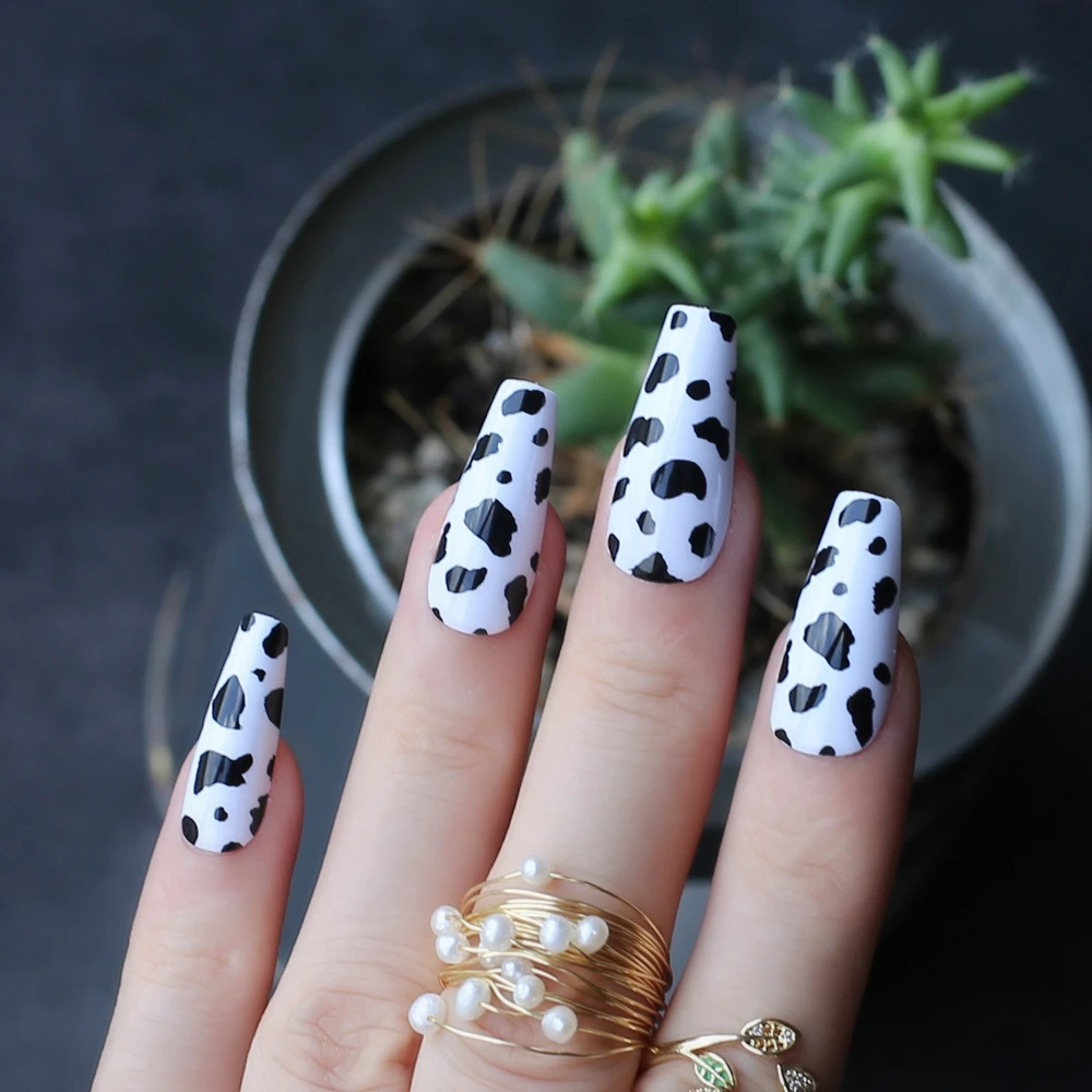 Корова печать накладные ногти Средний гроб накладные акриловые ногти УФ Дизайн гель Популярные черные пятна белый Арт Дизайн балет