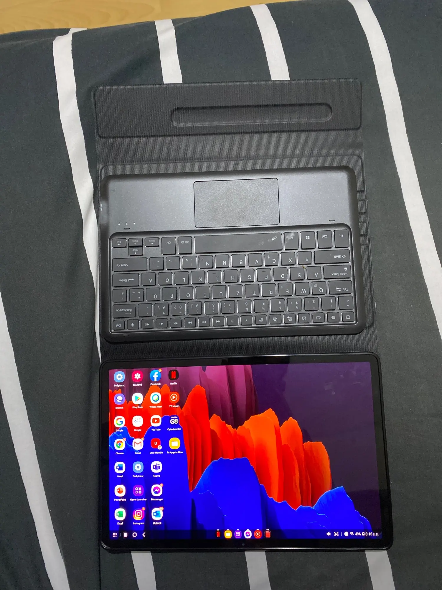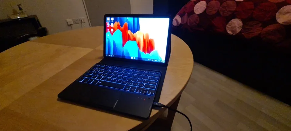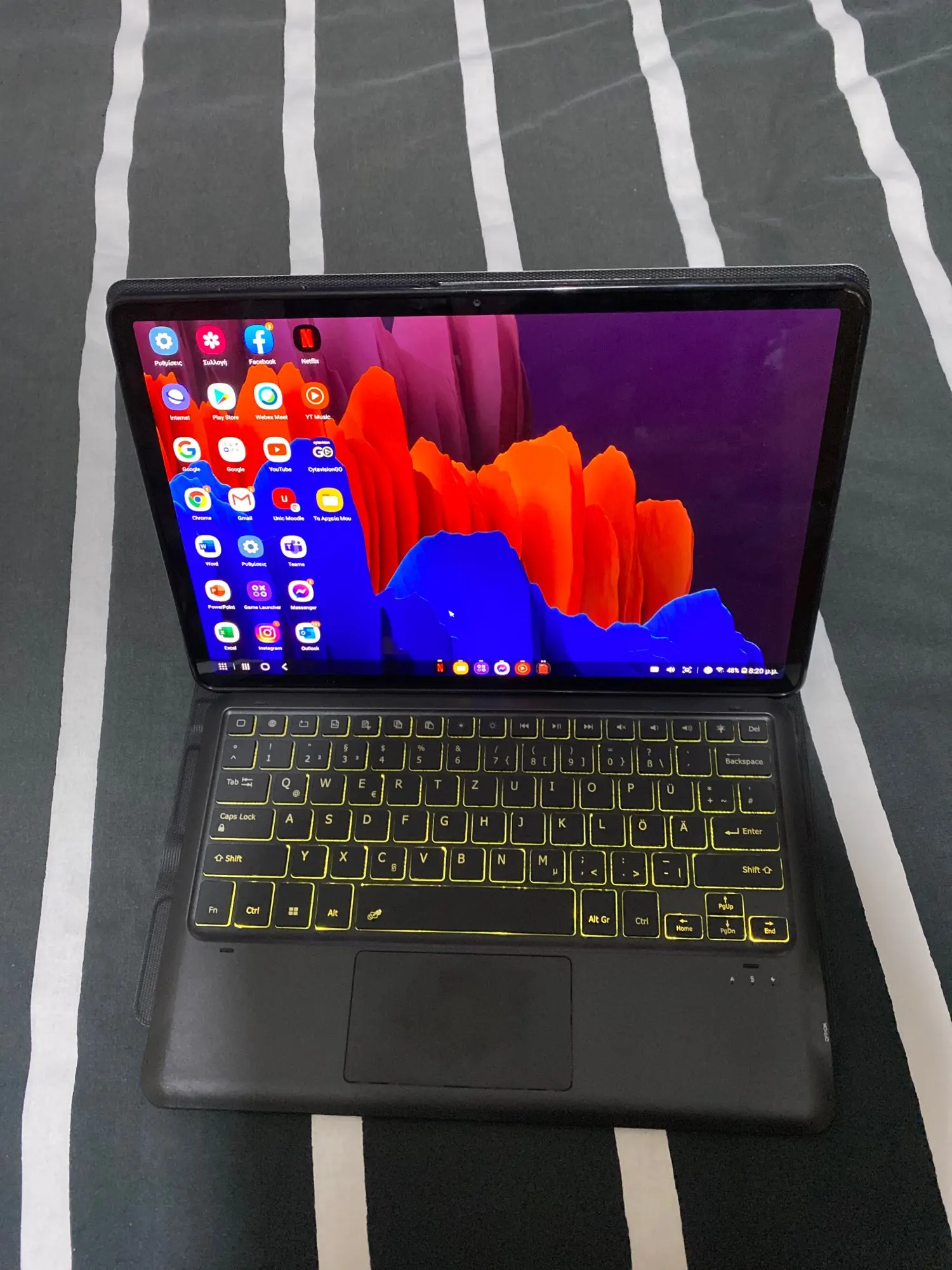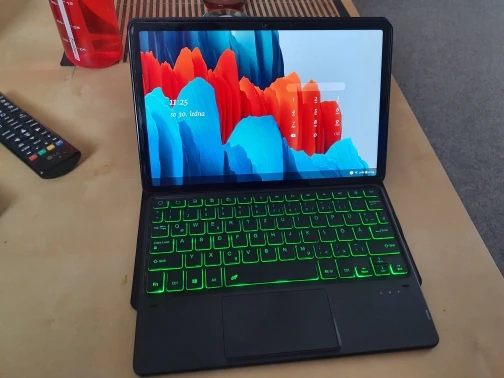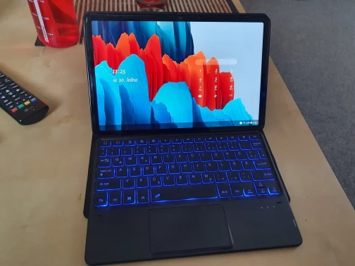 Muy bueno, bonito, ligero, de buena calidad, exacto para el tamaño de la Samsung Galaxy S7, el teclado se siente firme, es iluminado, varios colores de led. se conecta muy rápido a la tableta vía bluetooth, sin cables, la batería es muy buena lo he tenido días trabajando sin recargar. La protección a la pluma también es buena, el espacio es el correcto y no permite que se caiga.