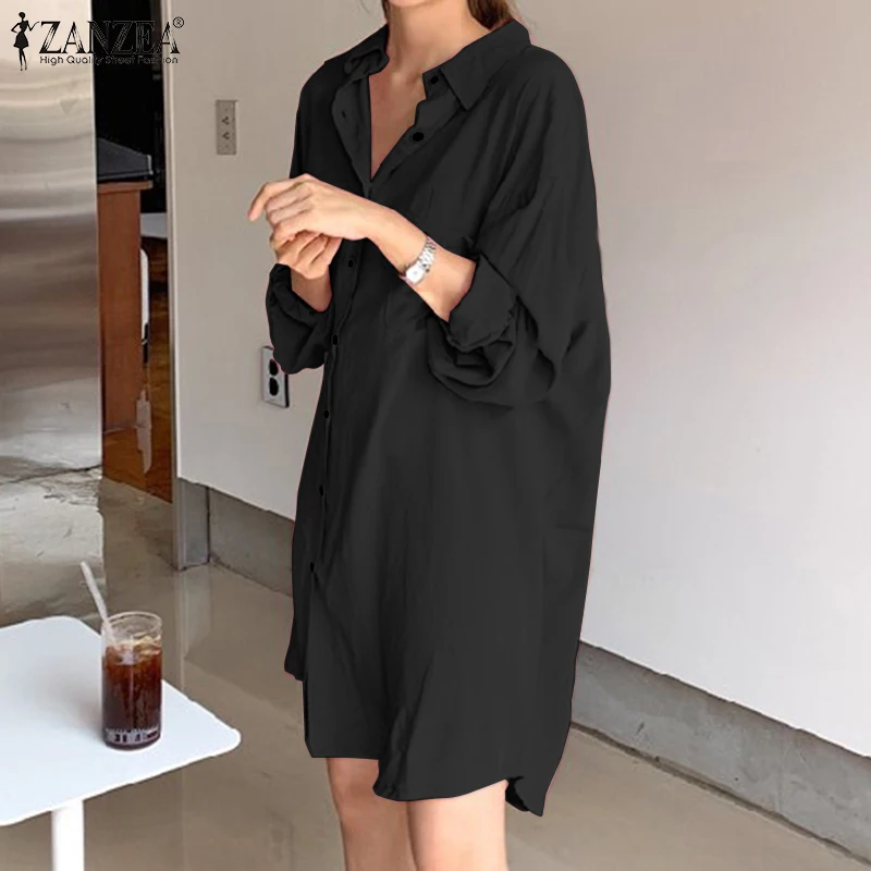 Женское Открытое платье без рукавов 2021 ZANZEA Повседневная элегантная Однотонная рубашка весеннее платье с длинными рукавами для лацкане коротким Vestidos женский халат размера плюс 5XL