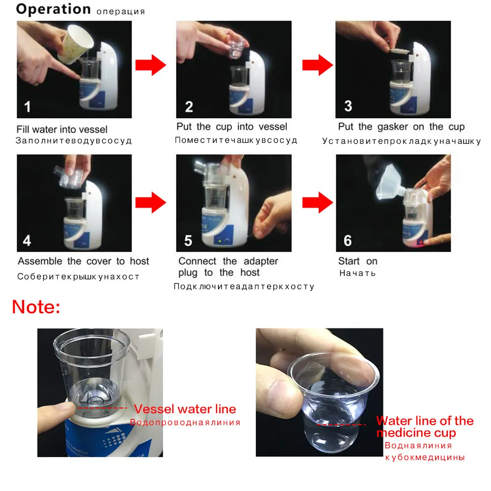 Введение: Наш небулайзер был конструирован для того чтобы предложить компактный, портируемый и легкий, удобный при получении ингаляционных процедур. Для создания эффективного высокочастотного тумана требуется обычная водопроводная или дистиллированная вода и выписанные врачом лекарства. Можно незаметно применять благодаря передовой ультразвуковой технологии, делающей ваш небулайзер беззвучным во время работы. Портативный ультразвуковой небулайзер следует использовать под suoervision лицензированного врача и/или респиратора. Характеристики: Материал: Медицинский Полипропилен Потребляемая мощность: 2,4 МГц Ультразвуковая частота: от 0,4 до 1,0 мл/мин в зависимости от медицинского значения Размер распыленных частиц: от 0,5 до 5 микрон Емкость лекарственного стакана: 10 мл. Максимун Количество лекарственных чашек: 5 шт. Емкость емкости: 25 мл Количество распыления 0,4 мл/мин.: автоматическое время 20 минут Количество распыления 1,0 мл/мин.: автоматическое время 10 минут Рабочее напряжение: DC1 Цвет бутылки: как показано на фотографии Размер коробки 1) OKA-517: 21,5*7*18 см 2) MY-520A: 18,5*7*16 см Посылка 1 шт. * хост 2 шт * мундштук 1 шт. * носовой (для номера модели OKA-517) 1 маска для взрослых 1 шт. * детская маска 1 шт * удлинительная трубка 1 зарядное устройство и 1 адаптер (110 В ~ 220 В) 5 шт. * чашка для лекарств 1 шт. * путеводитель небулайзера 1 шт. * резиновый круг 1 шт. * Прозрачная крышка 1 шт. * оригинальная коробка