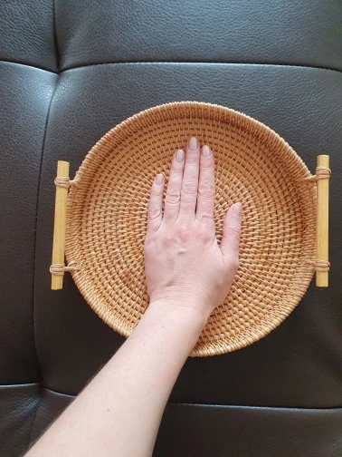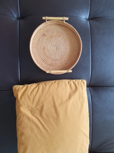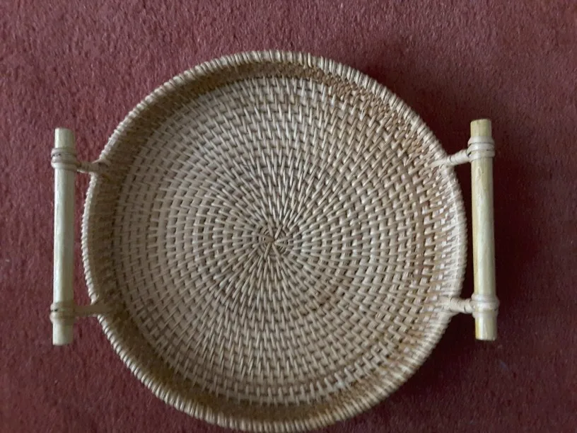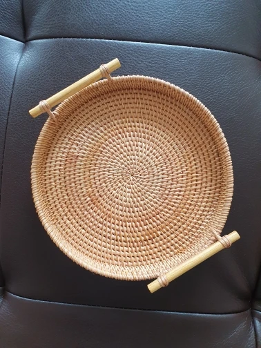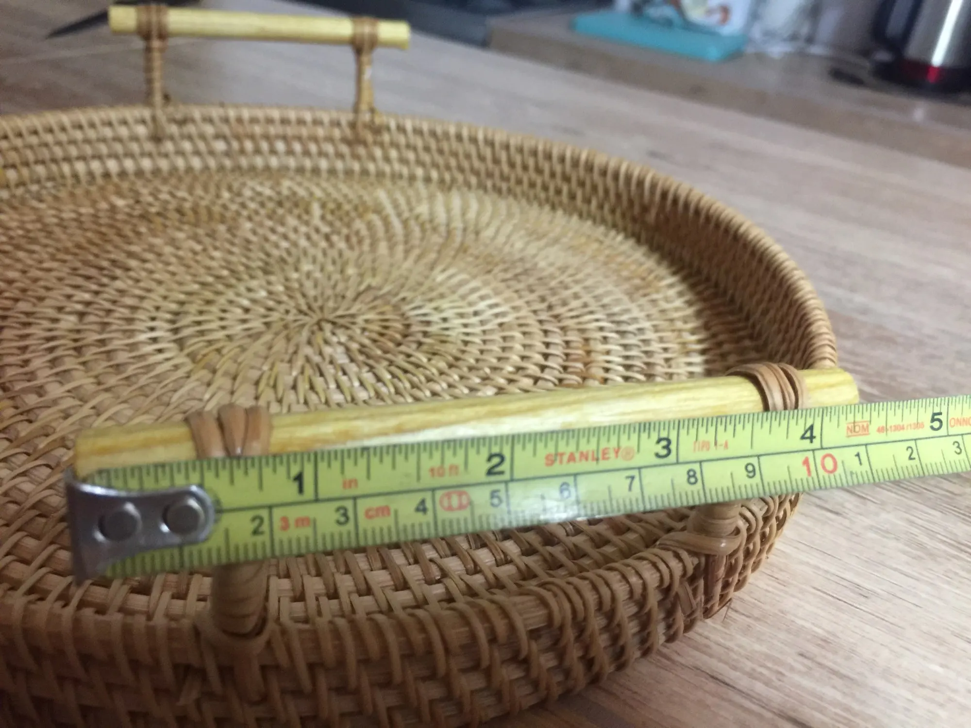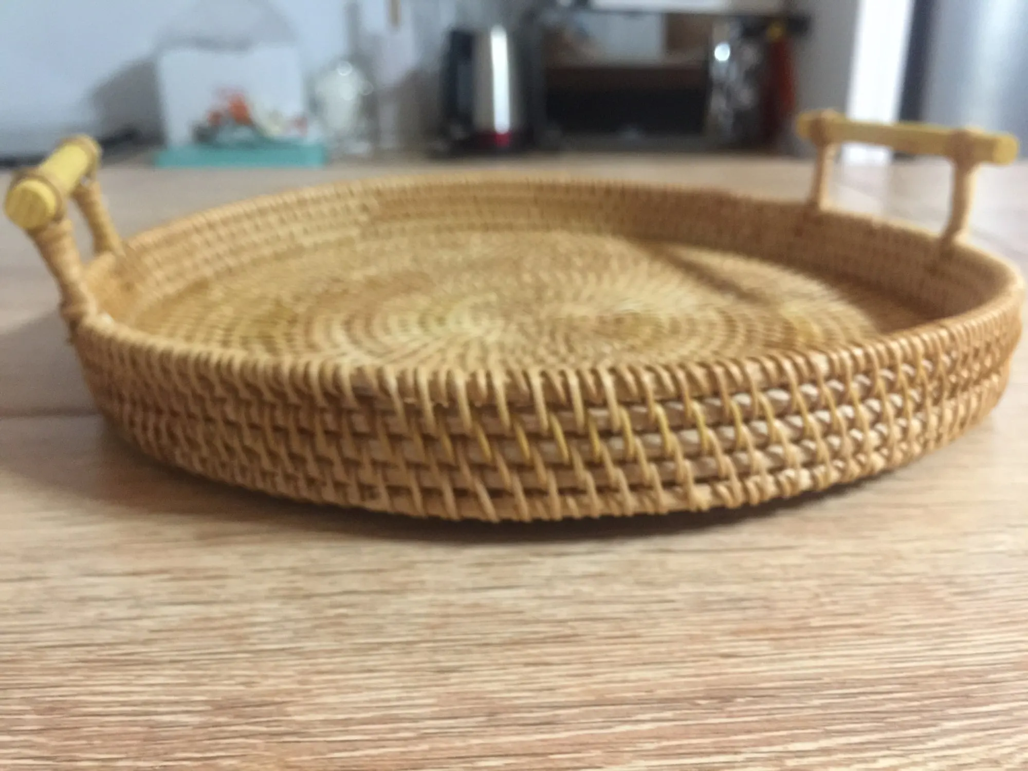 Плетеный поднос ручной работы из ротанга с плетеной корзиной деревянная круглая ручка, тарелка для хлеба, фруктов, тортов, сервировочный поднос