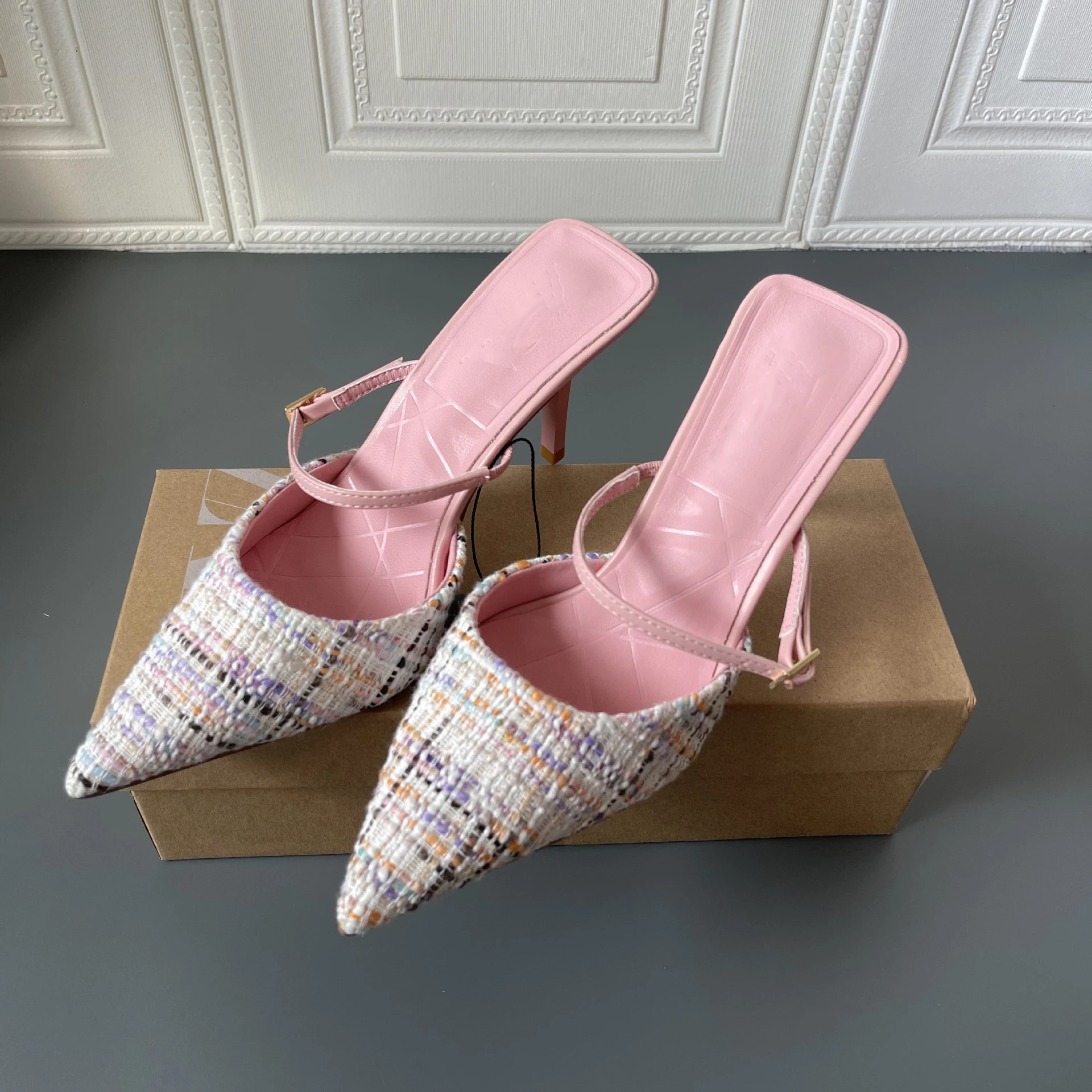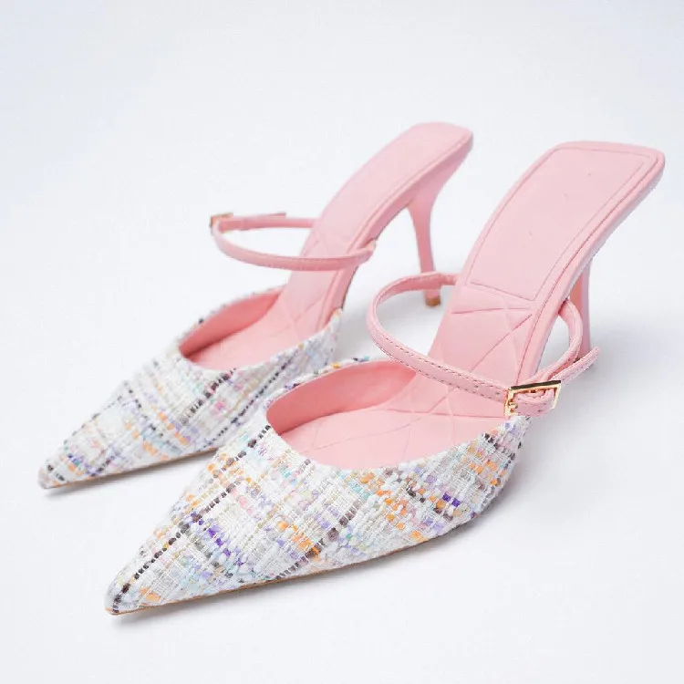 Женские твидовые туфли на высоком каблуке, заостренный носок, тонкий каблук, туфли-лодочки, сандалии из твида, лето-осень 2021