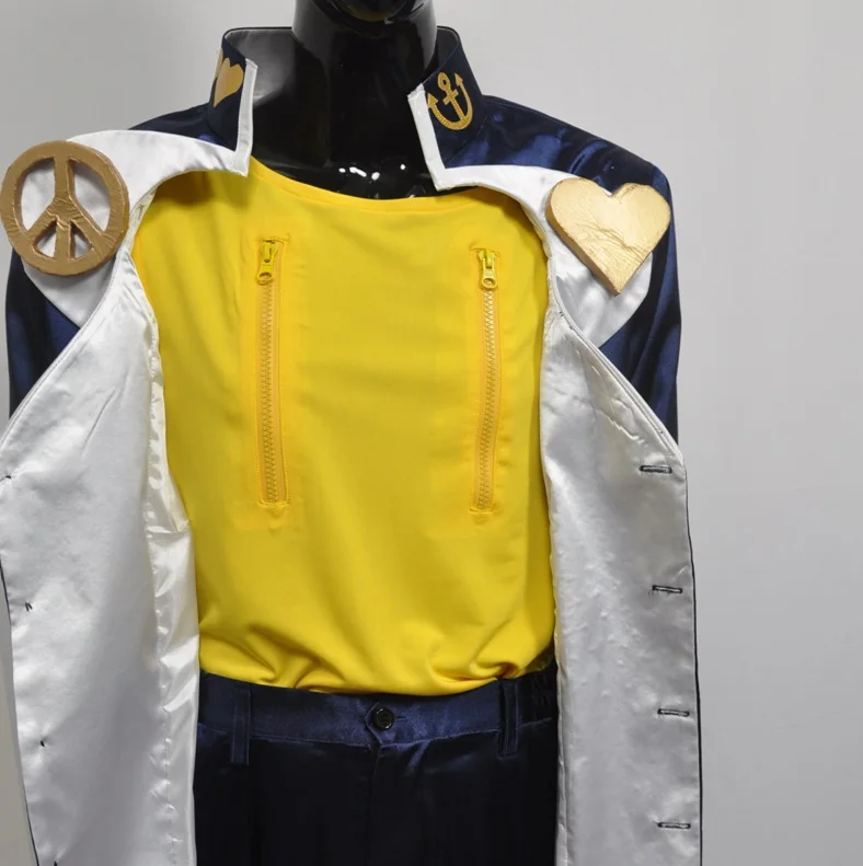 This costume is very well made and very nice looking. The fabric is soft and the shape of the open chest area is perfect. The golden zippers I did myself, just to add extra flair to it, but other than that everything else on this costume looks perfect and it fits very well.