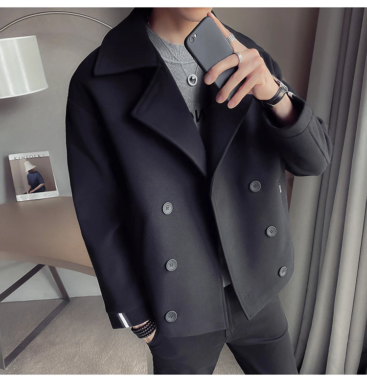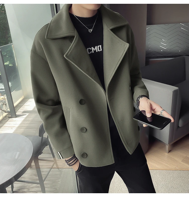 Зимняя шерстяная куртка, мужское Однотонное шерстяное пальто, мужское повседневное свободное Короткое шерстяное пальто для мужчин, тренчкот