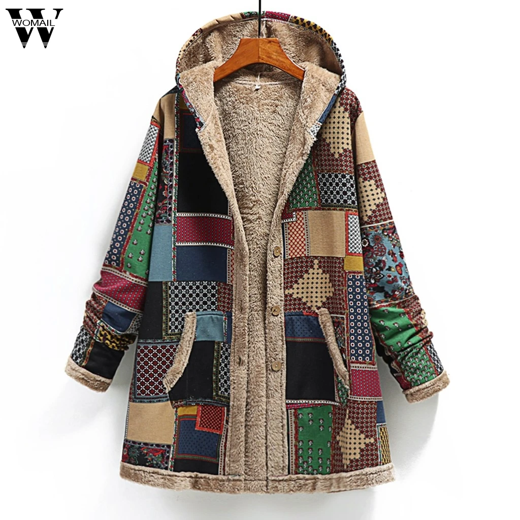 Женское винтажное пальто Womail, зимнее теплое пальто для мам, однобортное пальто с капюшоном и карманами, парка с принтом, размера плюс, 2019