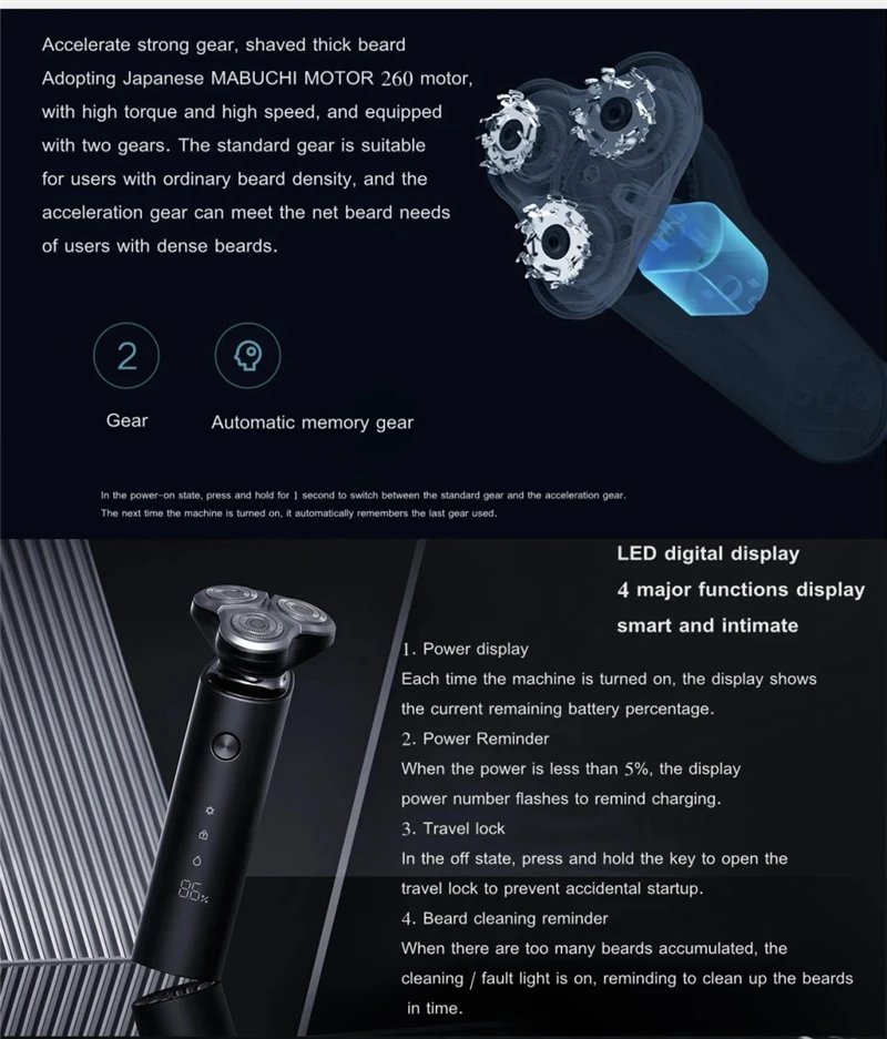 -Технология плавающего бритья на 360 °, подходит для всех контуров лица, более чистая.