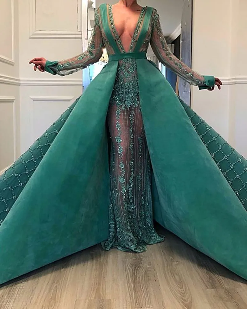 Женское вечернее платье-Русалка Abiye, изумрудно-зеленое кружевное платье с цветочным принтом, со съемным шлейфом, длинные рукава, 2021