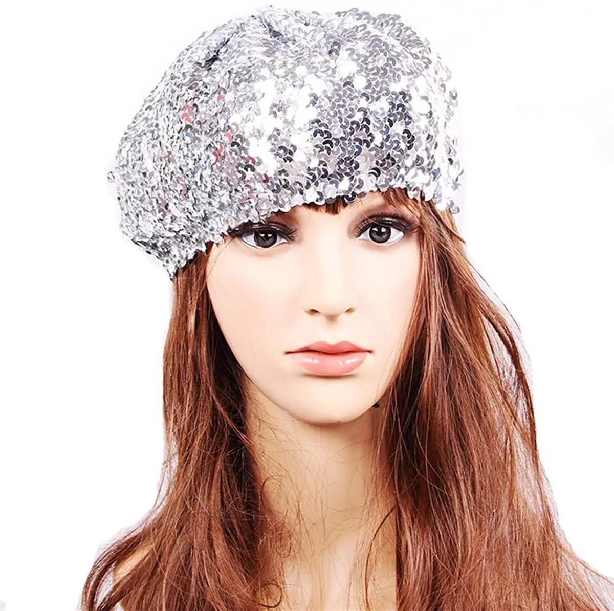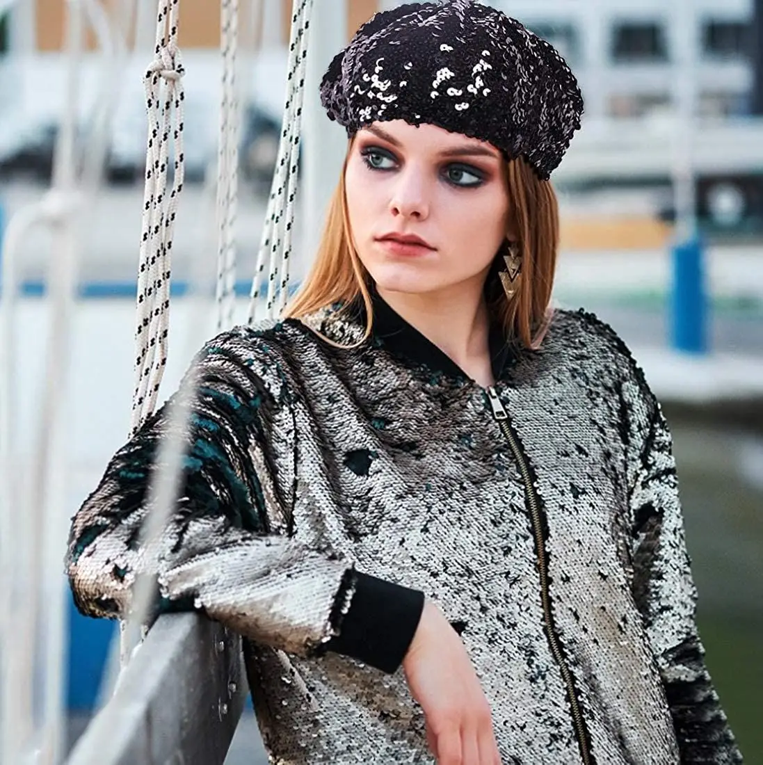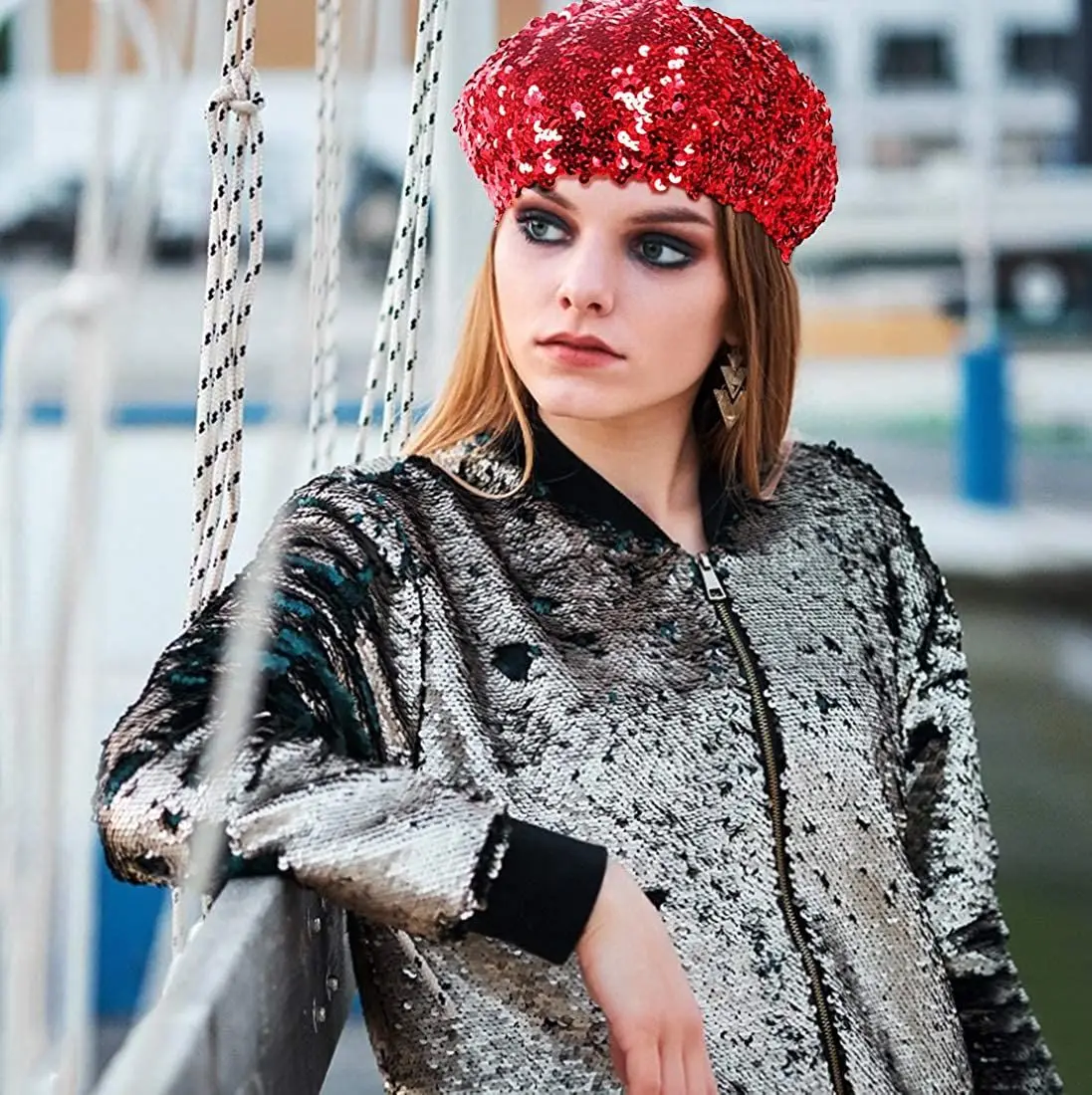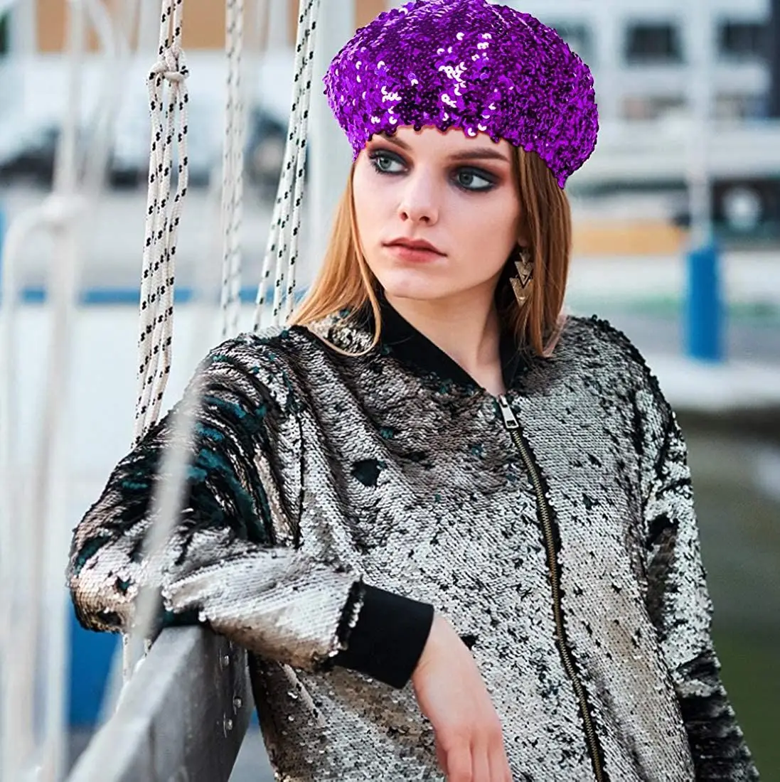 Женская модная Веселая блестящие пайетки мерцание стрейч берет шапка бини