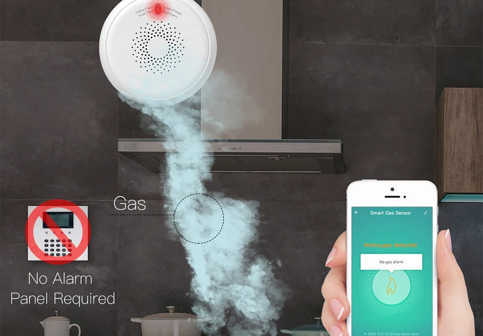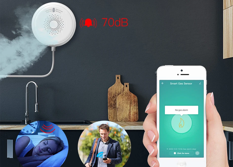 Совместимость с приложением Smart Life и Tuya позволяет своевременно обнаруживать опасность утечки газа и отправлять уведомления в режиме реального времени на телефон.