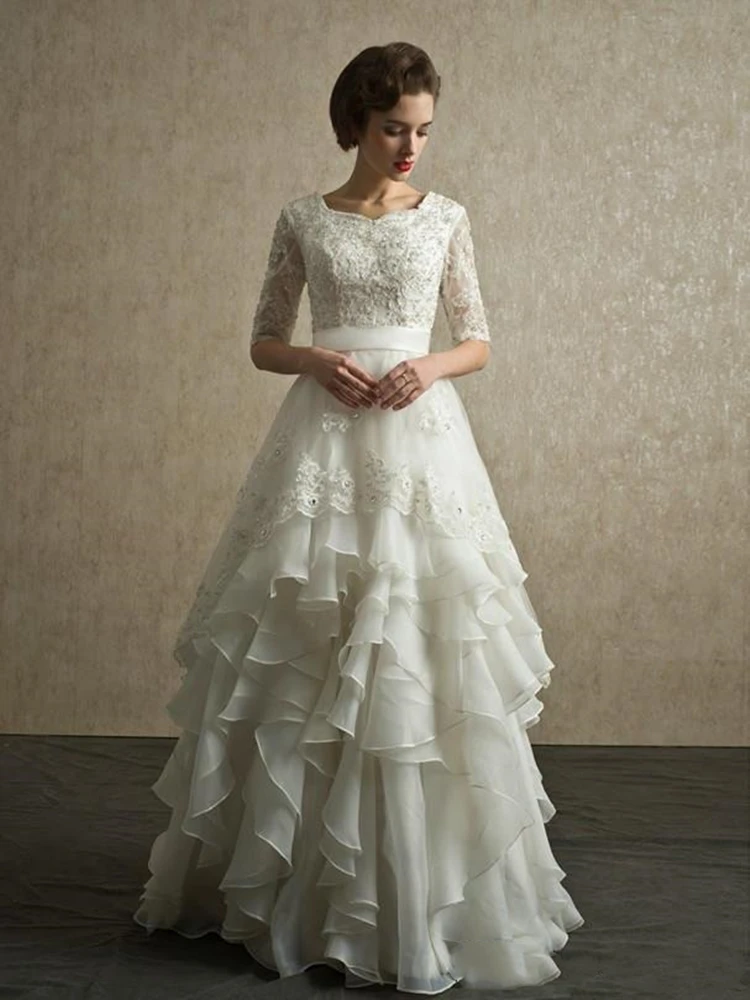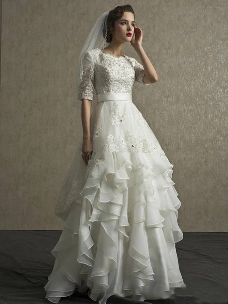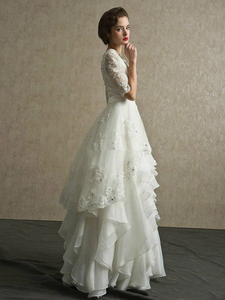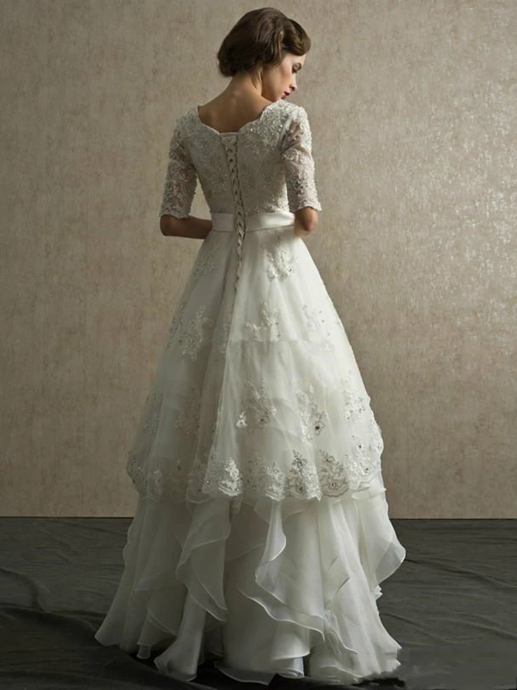 Винтажные Свадебные платья с рукавом до локтя, платье из органзы с глубоким круглым вырезом и аппликацией в несколько рядов, свадебные платья на шнуровке для загородного пляжа